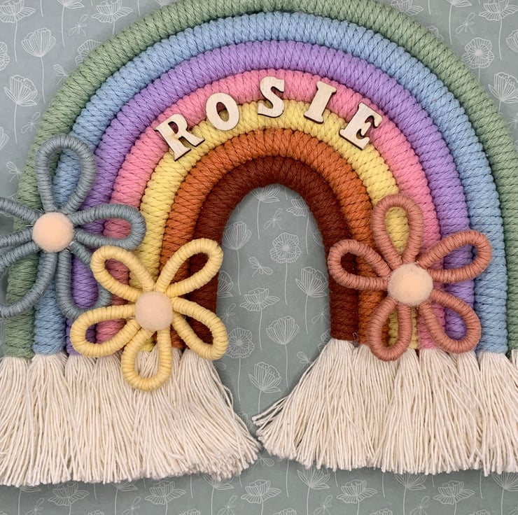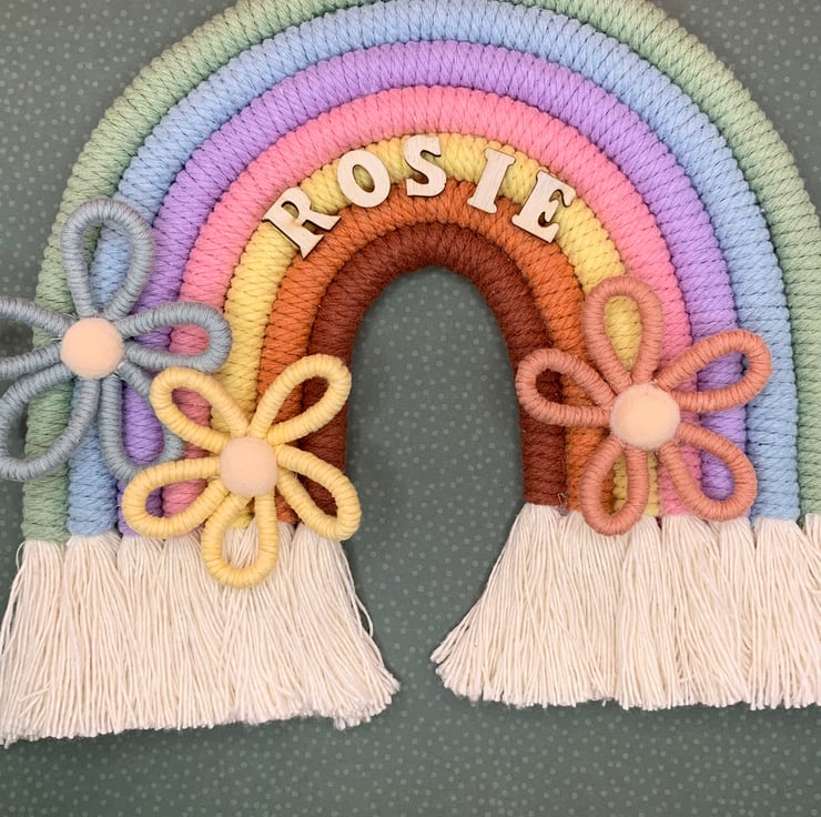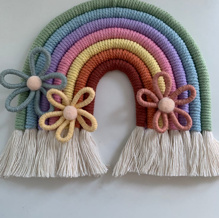 Beautiful hand made macrame rainbow with hand crafted flower details.