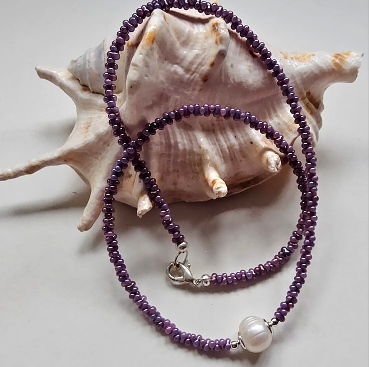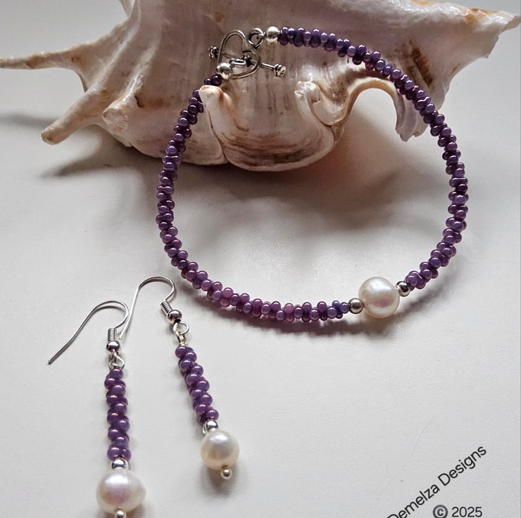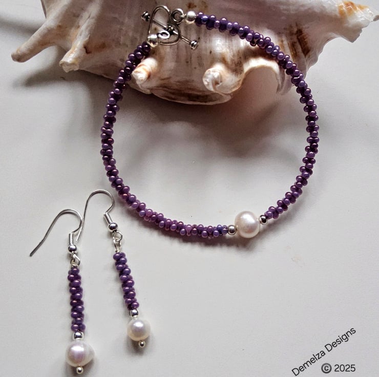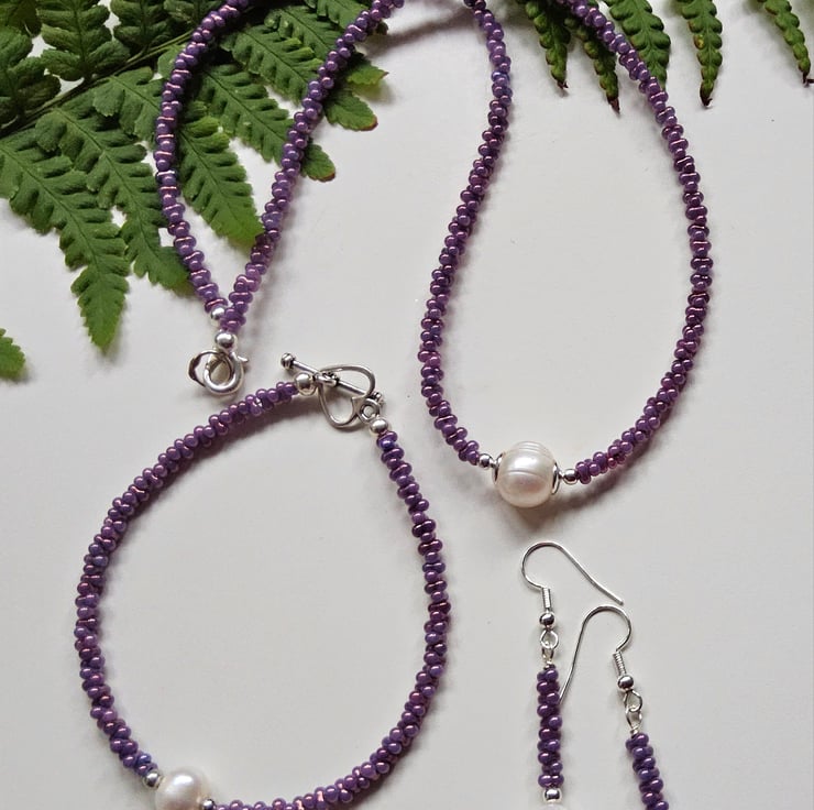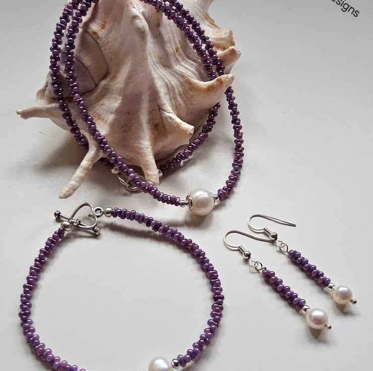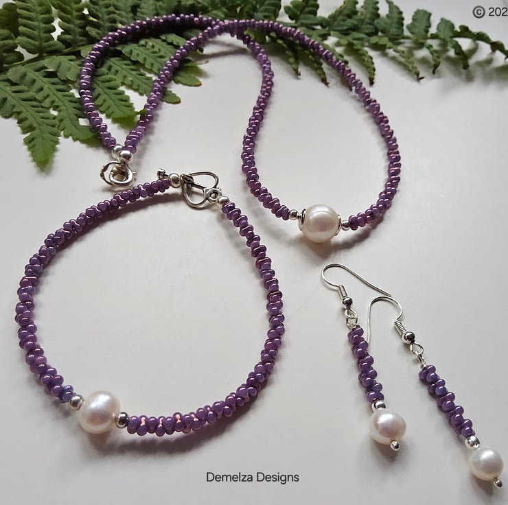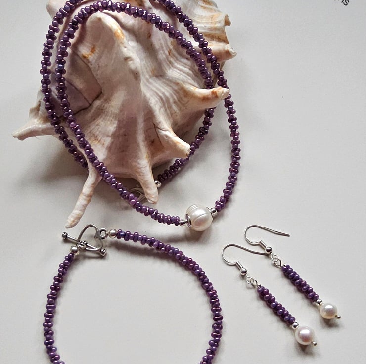 This gorgeous eye catching necklace, bracelet and earrings set has been designed and hand crafted in Cornwall using genuine baroque freshwater culture pearls complimented with purple pearlescent peanut shaped seed beads. These interlock together forming a rope effect. The centre pearls have quality silver plated spacer beads and the necklace has 6mm silver plated bead caps either side for added design detail.