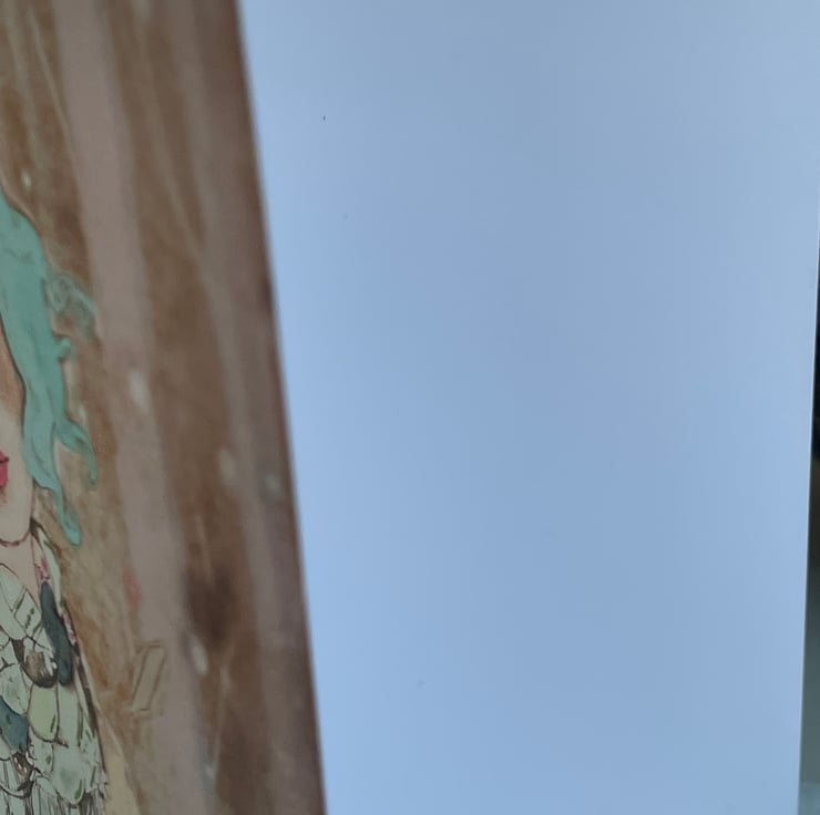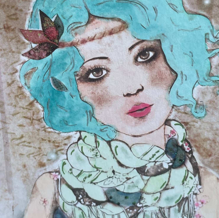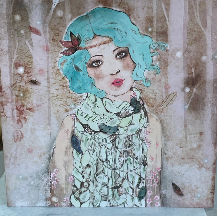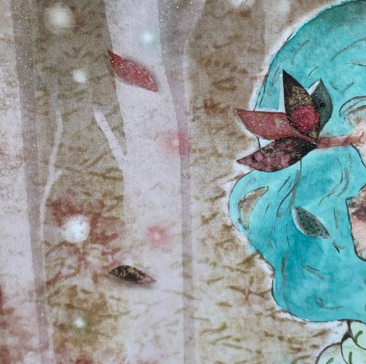 A bohemian, festival inspired card for any occasion. This 15x15cm card features a beautiful girl with turquoise hair. She is standing in a wood with falling glittered leaves. She is wearing a plated scarf around her neck. Her hair is a short style and has been coloured in a vibrant turquoise. She has a band tied around it. There is no greeting on the front or inside so it can be used for any occasion or could be framed as a beautiful piece of art.
