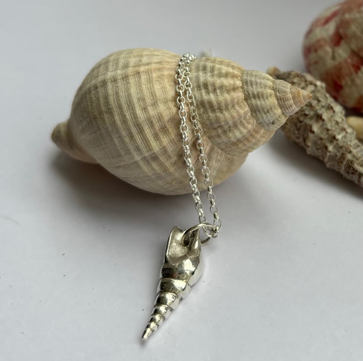 A beautiful shell pendant formed from fine silver with a sterling silver bail and 18” (46cm) sterling silver curb chain with lobster clasp. The shell measures approximately 25mm in length.