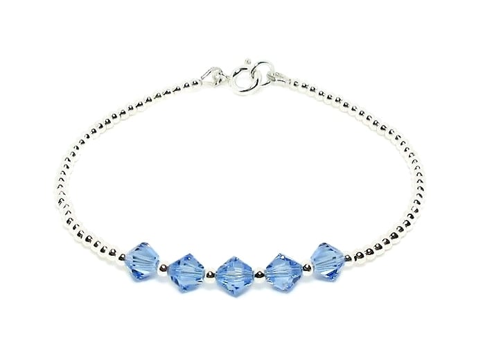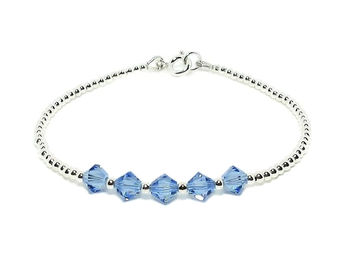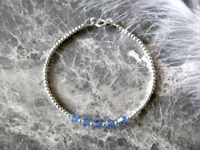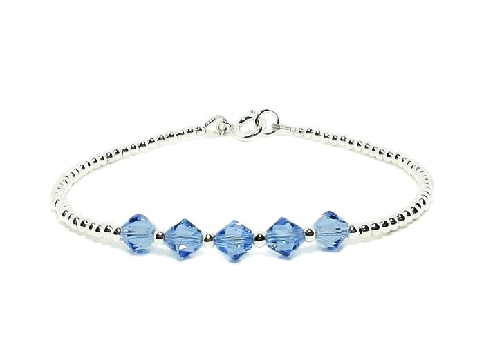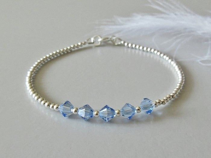 For this dainty, handmade Bridesmaids bracelet I've used 5mm blue crystals from Austria in a pretty shade of Light Sapphire. The remainder of the bracelet has small & seamless, shiny Sterling Silver round beads.