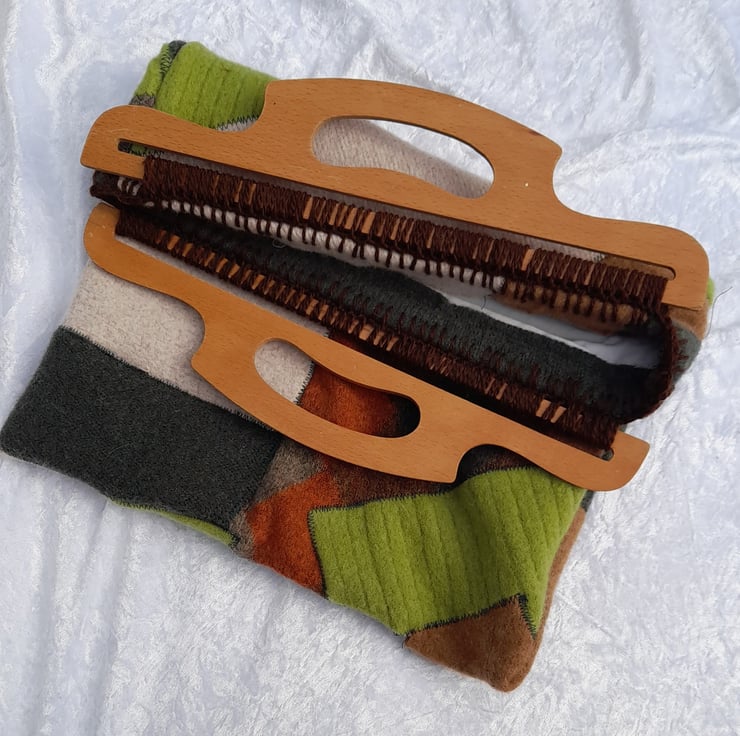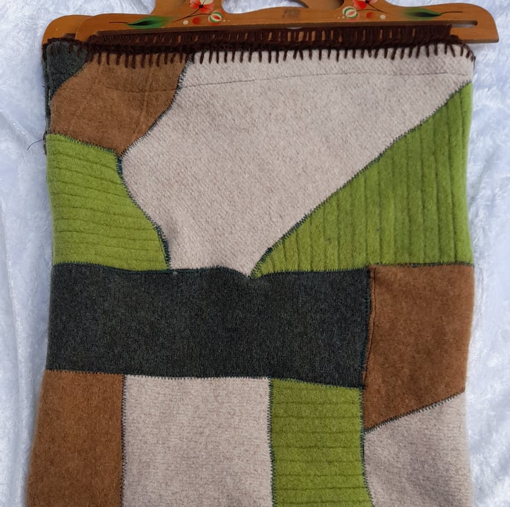 Make a statement with the one-of-a-kind upcycled fabric bag. Felted wool sections have been jigsawed together to make a unique pattern, finished off with vintage wooden handles hand crocheted to the bag.