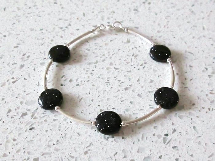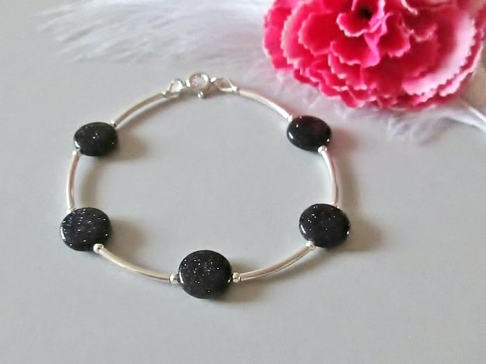 This very dark blue Goldstone coins bracelet has a wonderful sparkle all of its own. I also have the brown Sandstone version if you prefer.