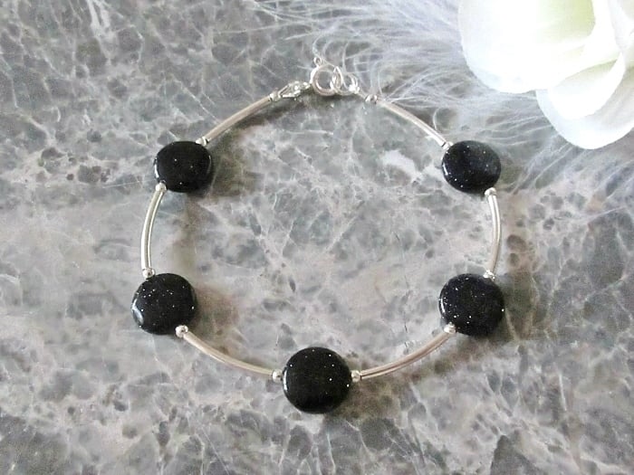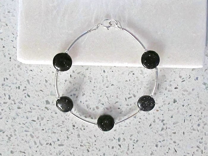 I handmade this sparkly navy blue bracelet with beautiful, dark 10mm Blue Goldstone rounded coin shaped beads. Completing this design & creating its bangle style are seamless, shiny Sterling Silver round beads & curved tubes.