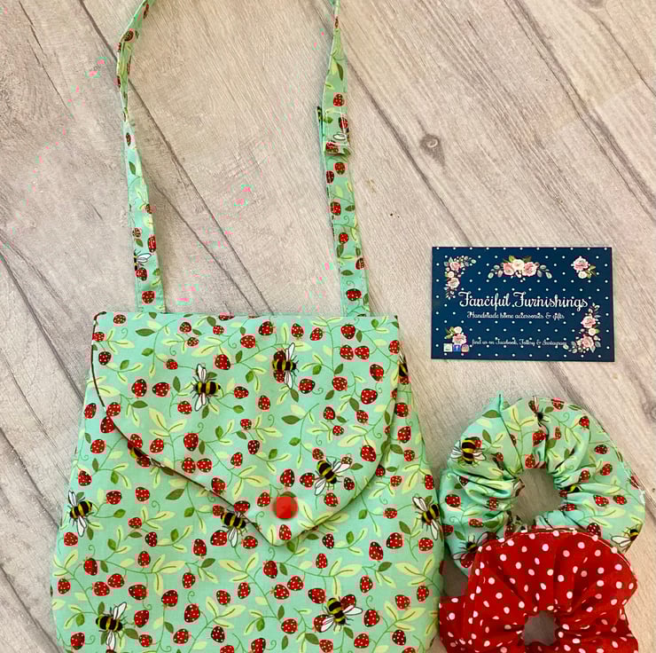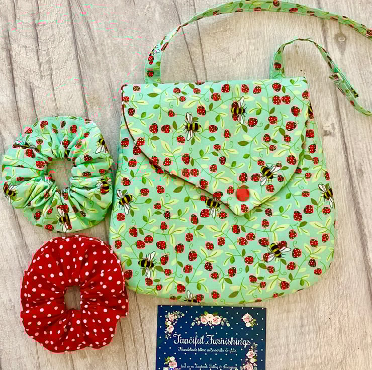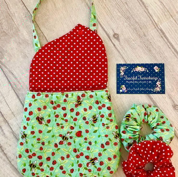 Bag measures approximately 7” x 6.5”, fully lined and has a popper fastening. I’ve also added Velcro to the strap to avoid it being choking hazard for a child. I have other designs available.