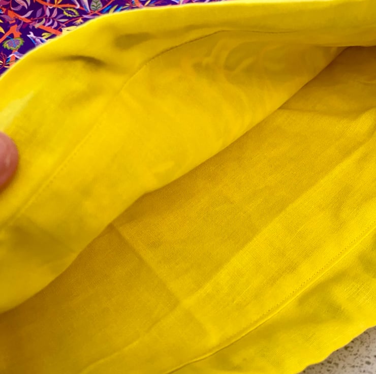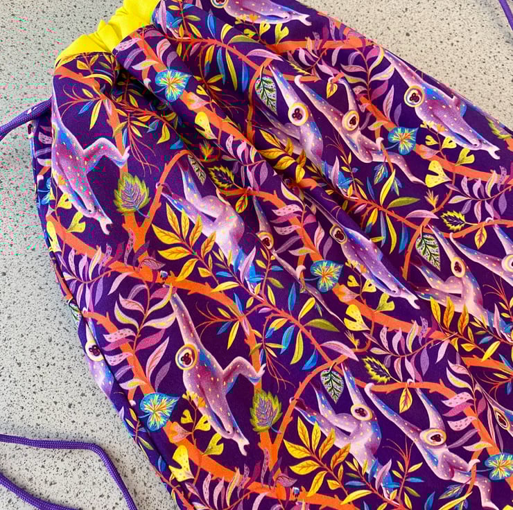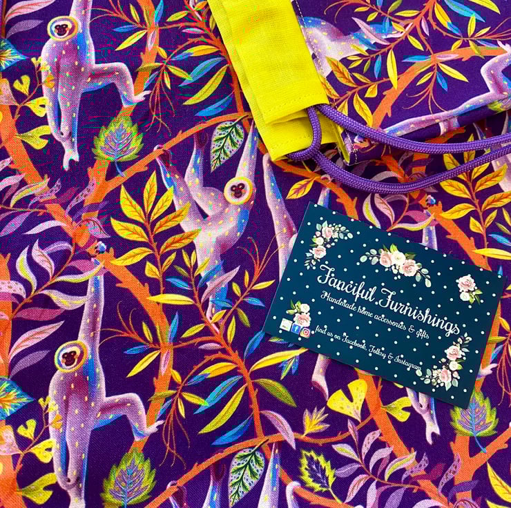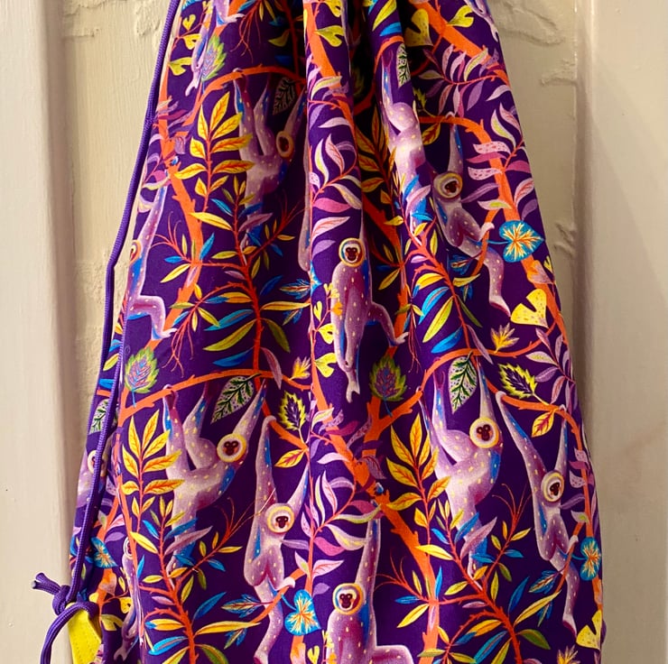 Children’s drawstring backpack. This amazing 100% cotton monkey fabric in shades of rich purple looks amazing teamed with the vibrant yellow cotton lining.