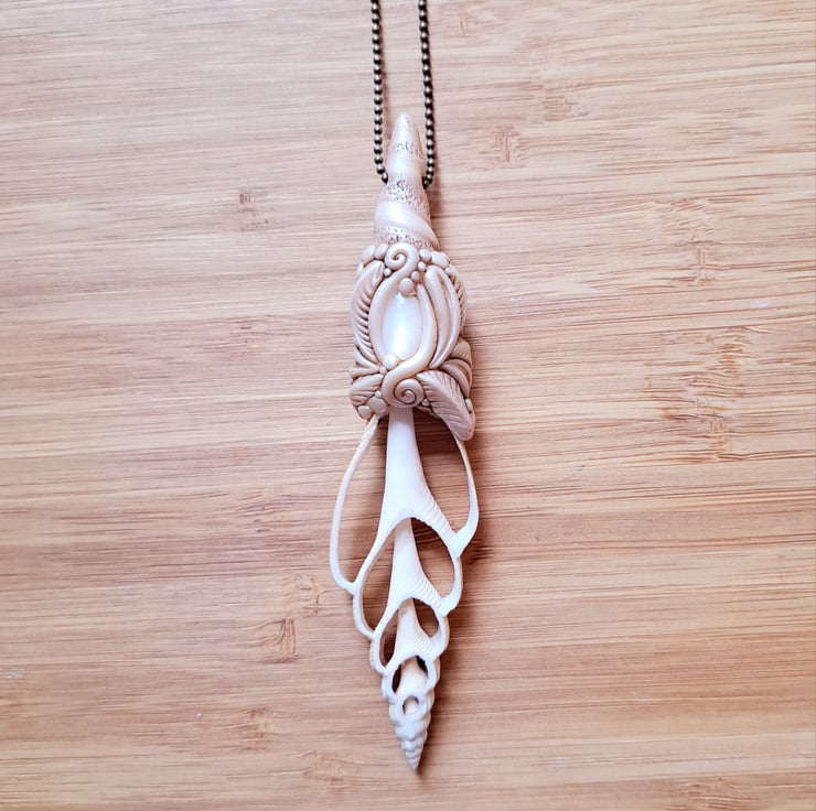 This pretty amulet has been crafted using a beautiful shell slice and mother of pearl, set with polymer clay. It is mounted on bronze chain that slips over the head. It can be shortened by unclipping from clasp, snipping with scissors and reconnecting to clasp.