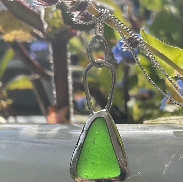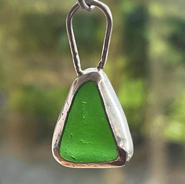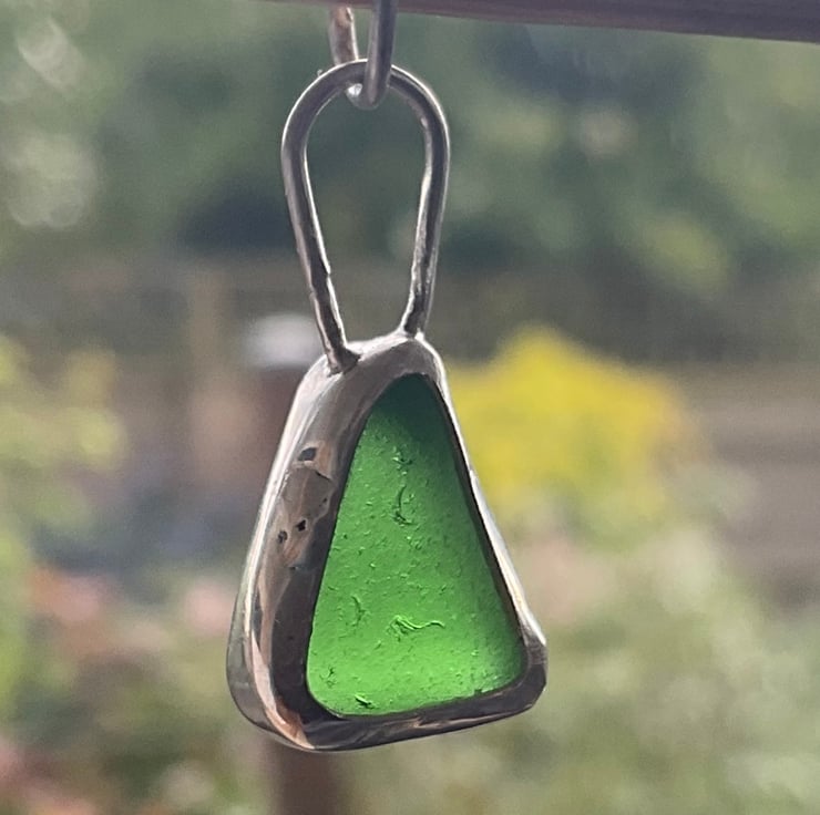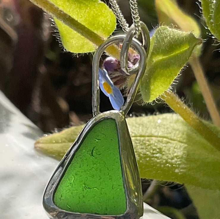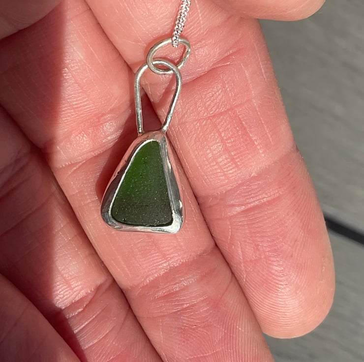 I found this piece of seaglass whilst on holiday in Gozo, Malta in October 2023. There's one beach on Gozo which has so much seaglass, it's extraordinary! This piece glowed in amongst the shingle and due to it's size, shape and colour it just cried out to be placed into forged silver to become a pendant.