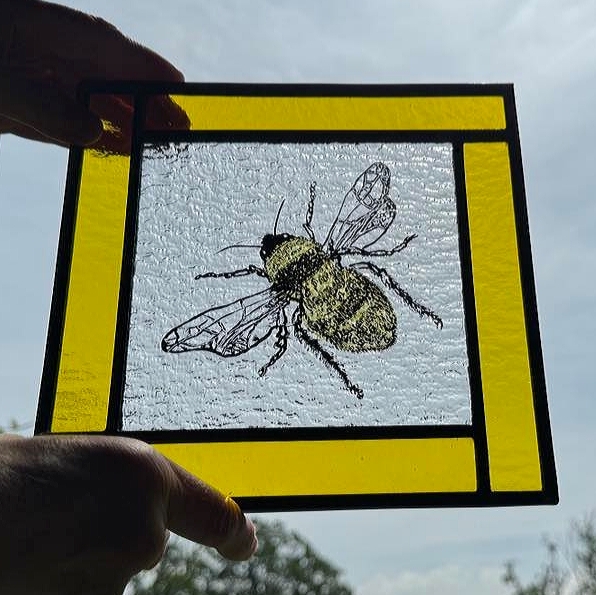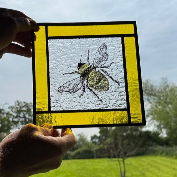 This stained glass panel features a painted bee central insert, created using specialist glass enamels painted onto a clear, textured piece of glass, and kiln-fired to make the enamel permanent. The panel was then constructed using traditional leaded stained glass techniques, which have changed very little over the centuries. The bee is set in a surround of very cheerful yellow transparent art glass, and the lead frame was cut to size, soldered, and then cemented, black-leaded and finally polished.