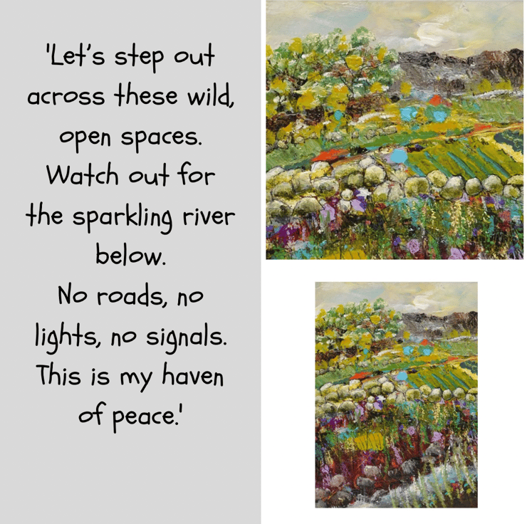 This is a Scottish landscape painting. There are days when I just love letting our dog off the lead so we can tramp through the rugged countryside. Although wild, such places can still be so beautiful as the light and weather can change. The rustic colours I’ve chosen for the land contrast to the small blue stream that meanders at the bottom of the artwork.