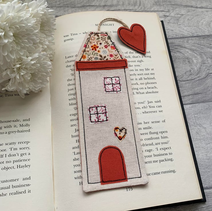 A bookmark in the shape of a tall narrow house, a fun gift for a bookworm.