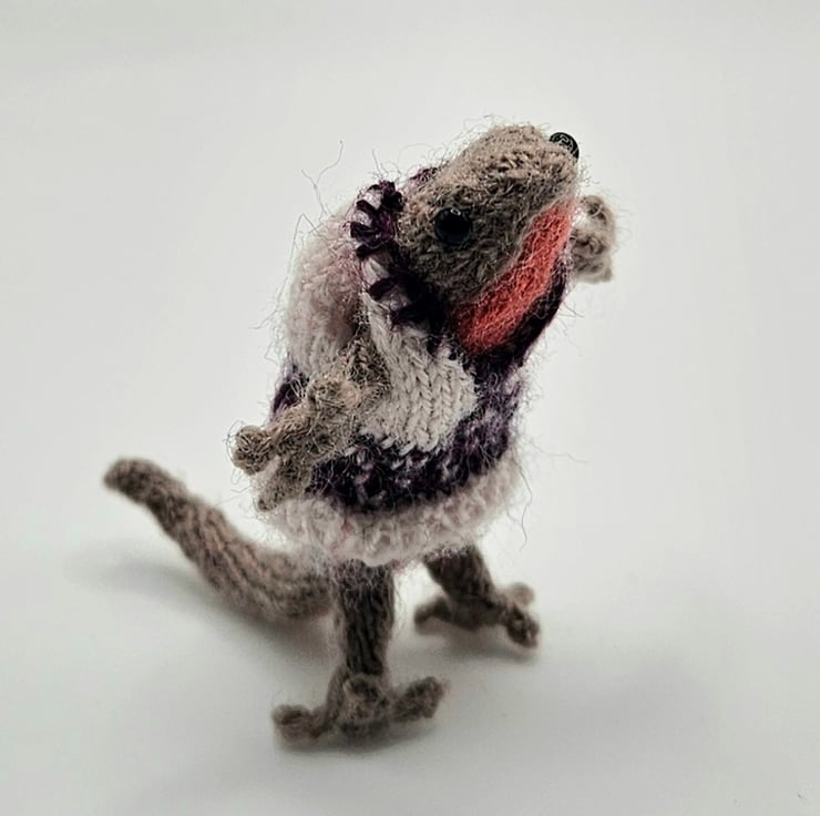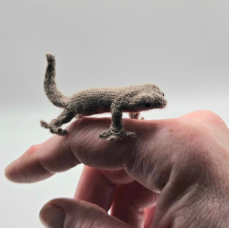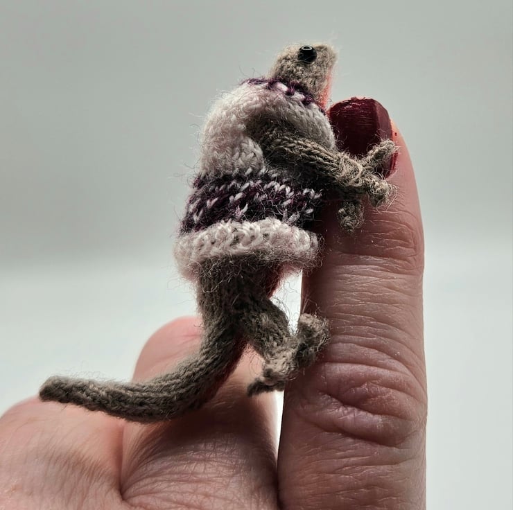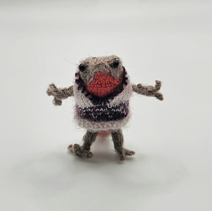 Tiny hand knitted Newt stands at 1.5 inches tall. Newt is fully poseable and made from 100% Merino Wool. He comes with a little vest. I can knit the vest in your choice of colours, for instance a favourite teams colours. Not suitable for children due to wire armature and very small eyes.