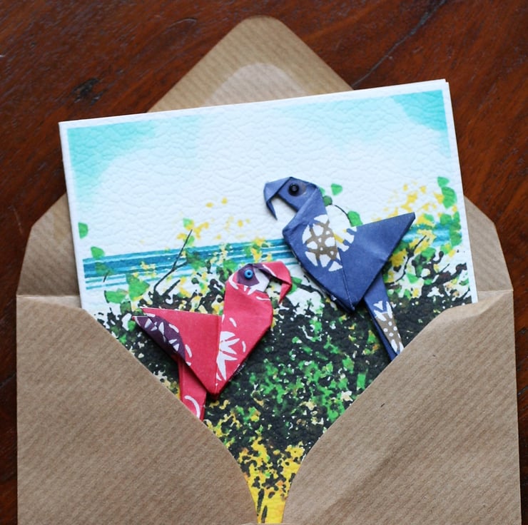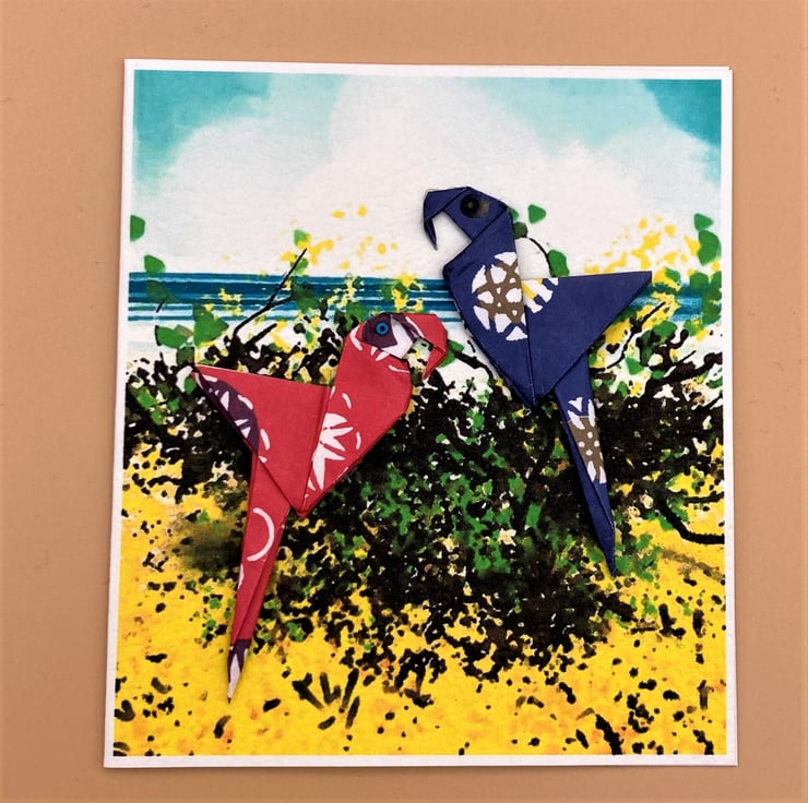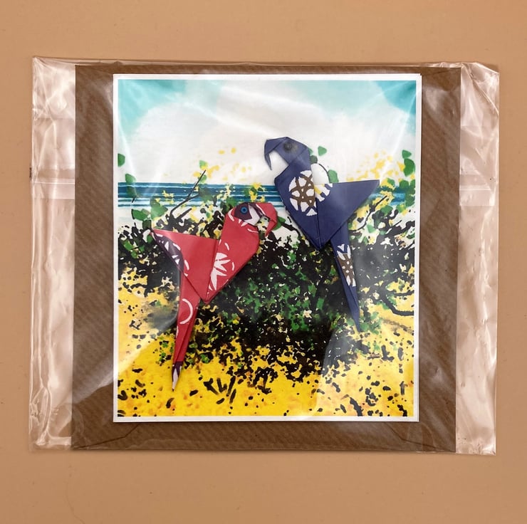This card is really unusual with it's hand folded, colourful origami parrots, attached to one of my original design prints. The colourful birds look very tropical perching in bushes at the edge of the beach.
