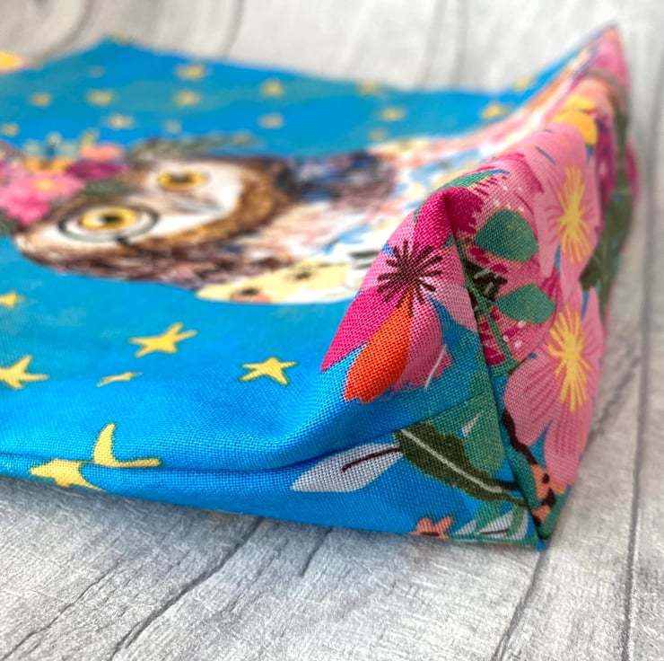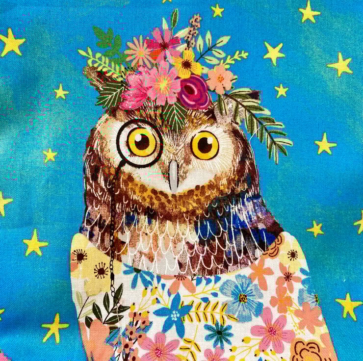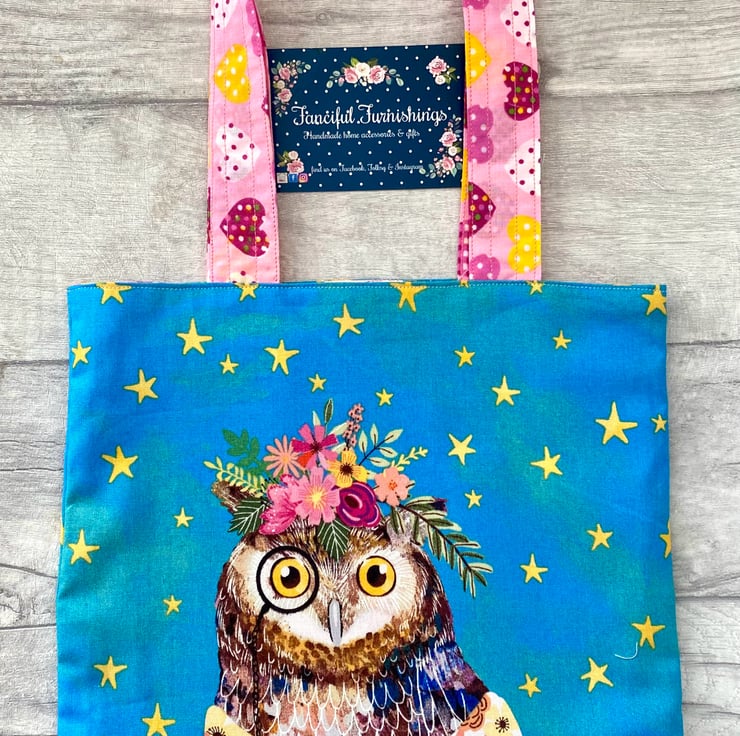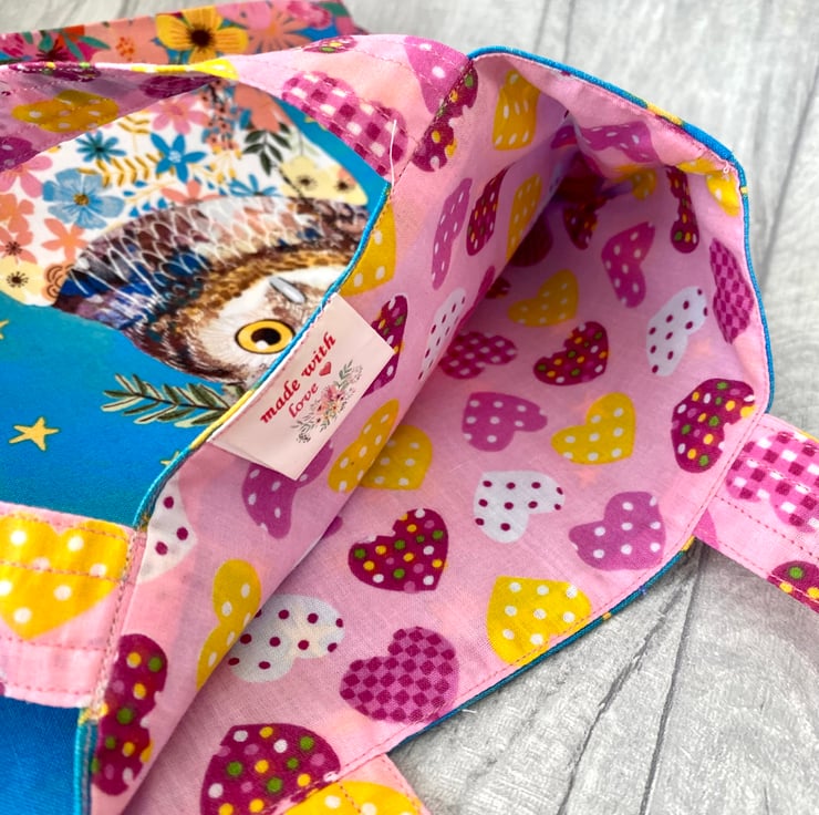 Super cute Owl mini tote bag perfect for your child to carry their favourite book or a few toys. Measures approximately 9.5” x 8.5”. Fully lined in a co-ordinating fabric.