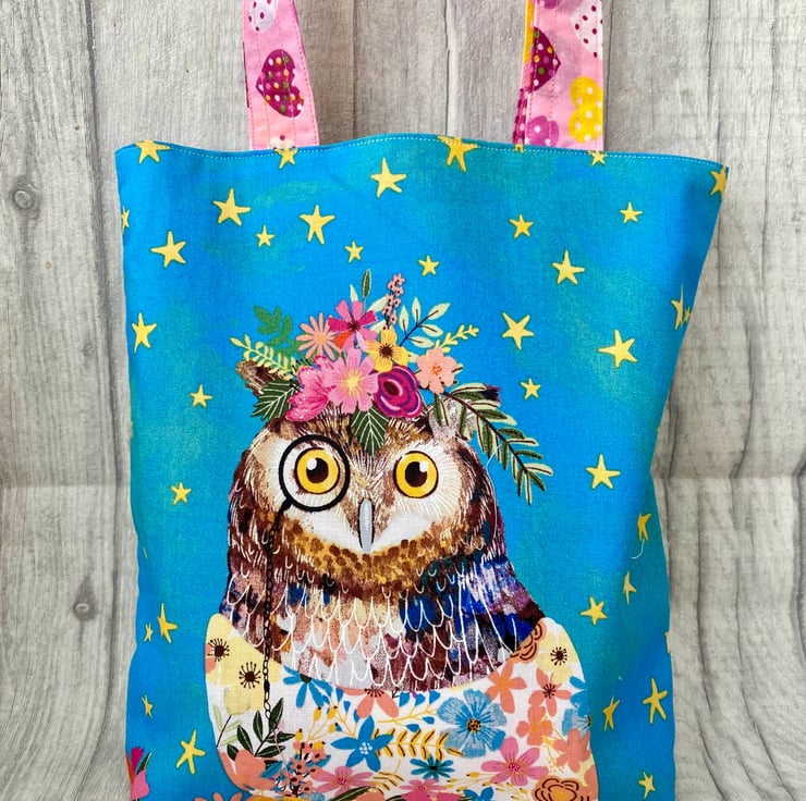 Super cute Owl mini tote bag perfect for your child to carry their favourite book or a few toys. Measures approximately 9.5” x 8.5”. Fully lined in a co-ordinating fabric.