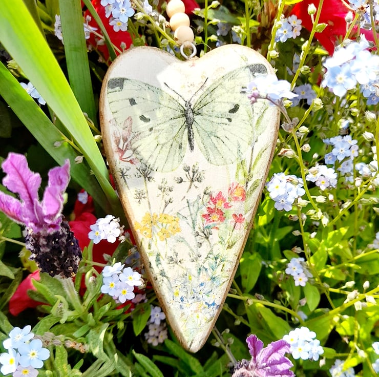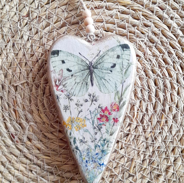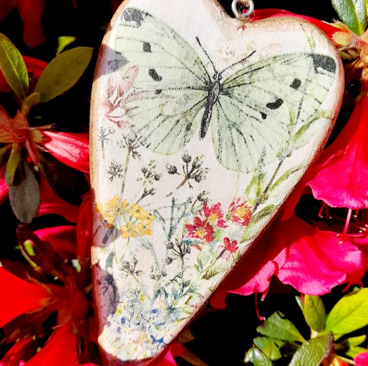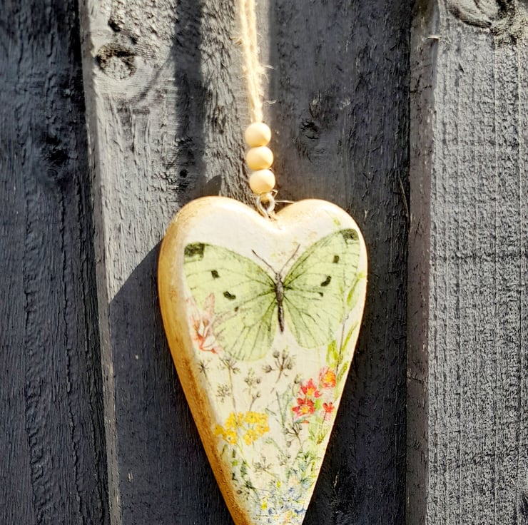 Pretty butterfly & country garden florals decoupaged onto this hanging Wooden heart.