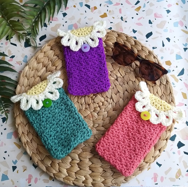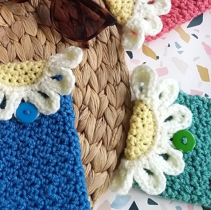 These cases are a fun way to stop scratches to your sunglasses or regular reading glasses while they’re in your bag or pocket. Made with a squishy yarn to cushion the glasses with a funky flower and button fastening. They can also hold a mobile phone too!