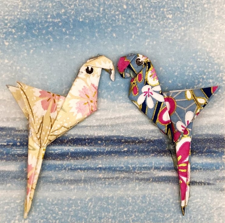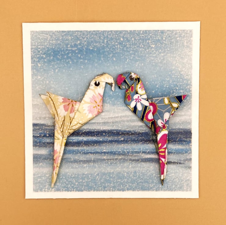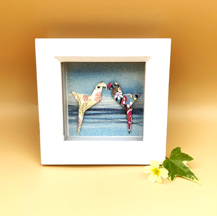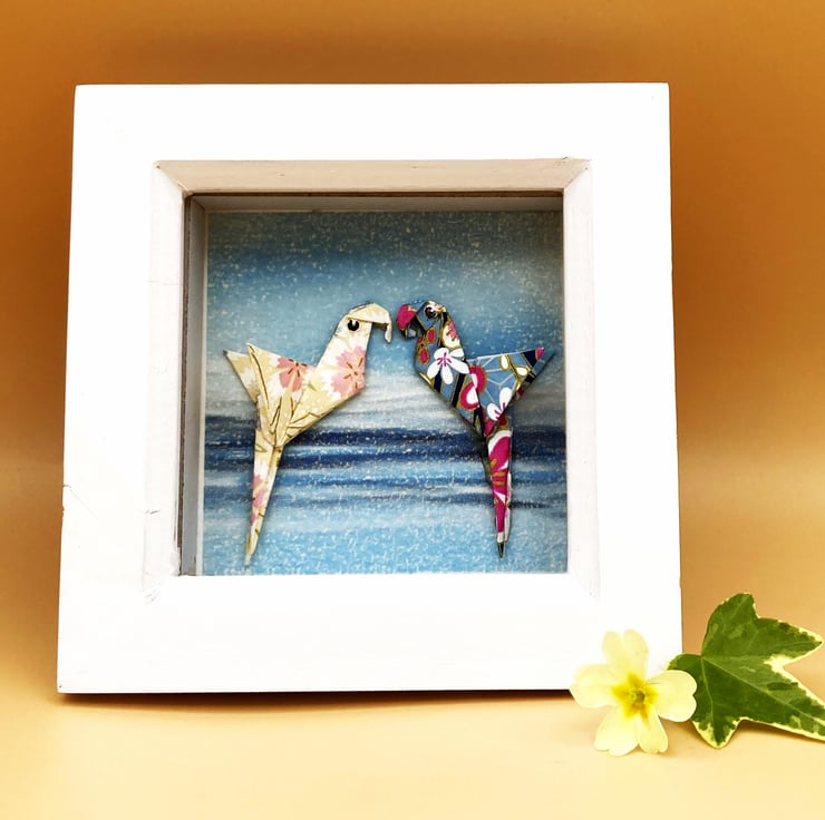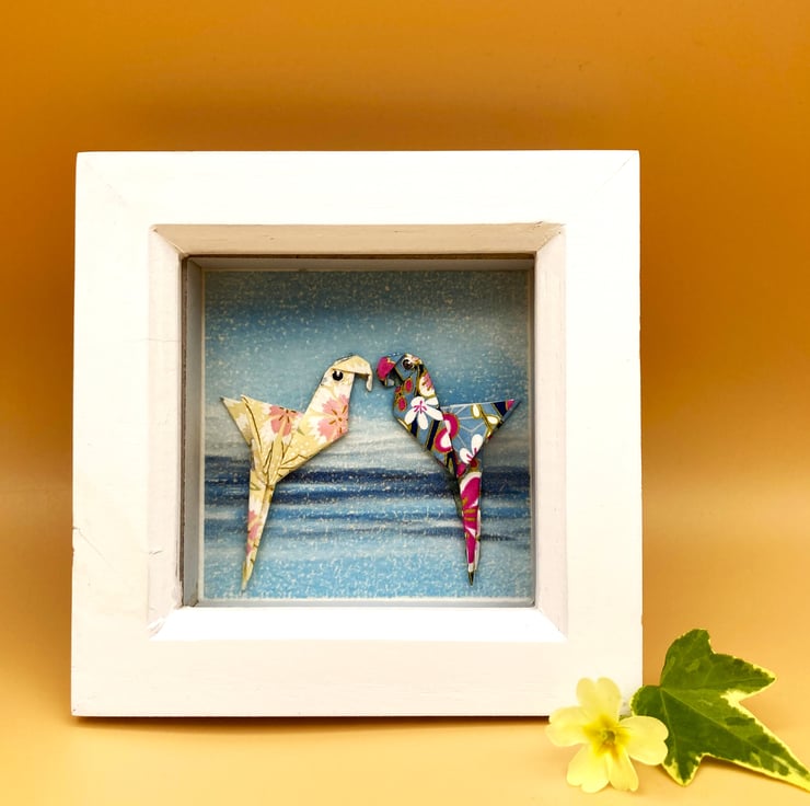 These colourful hand folded origami parrots are firmly attached to one of my original abstract design prints and presented in a white box frame. Each little picture has been hand made & signed and dated by me. I carefully choose genuine Japanese origami paper in complimentary colours and position them on the abstract blue background, the combination of print and origami makes each picture completely unique. The box frame enhances the 3 dimensional quality of the origami and make this an attractive, unusual and quirky gift - perhaps for a romantic occasion as they do look like a pair of love birds.