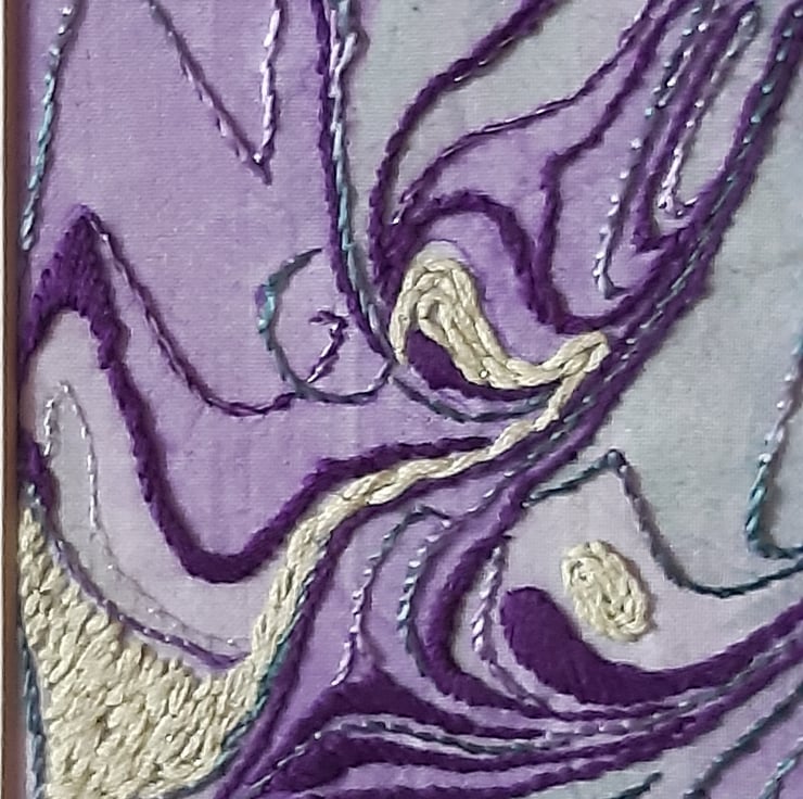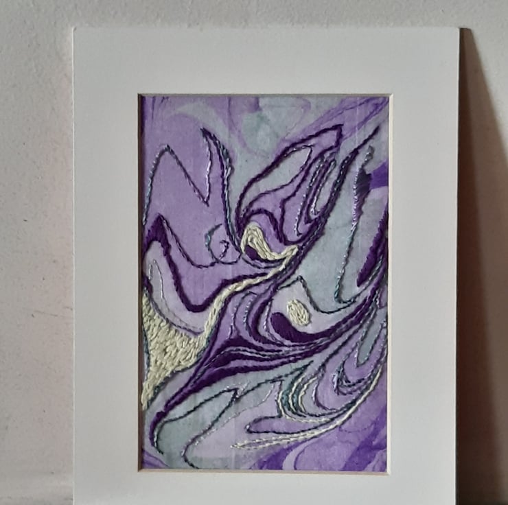 Abstract hand embroidery on marbled cotton fabric, mounted ready for you to frame. External measurements, 15 x 20 cm