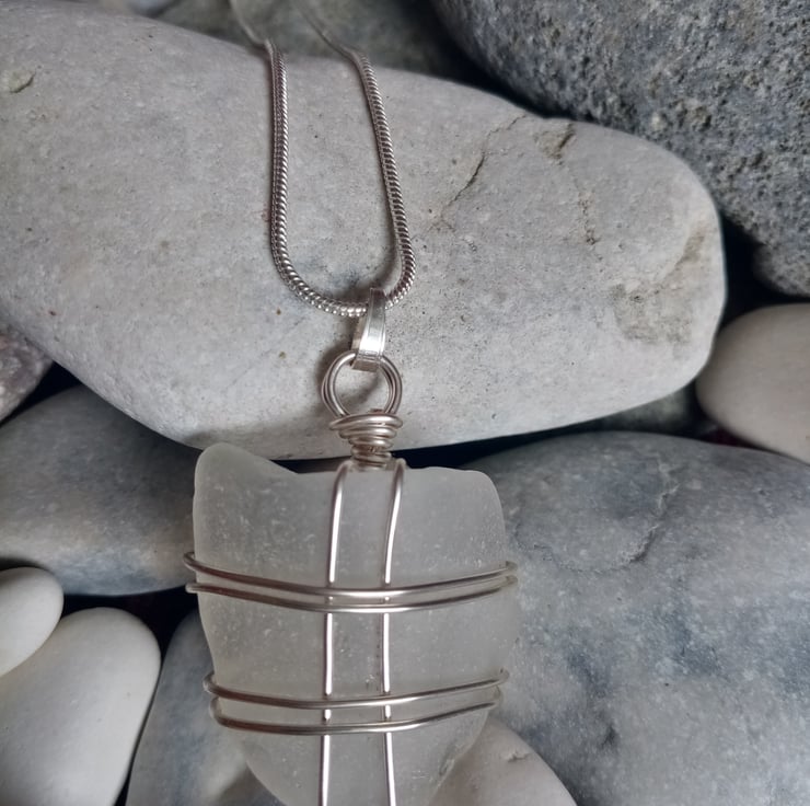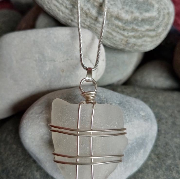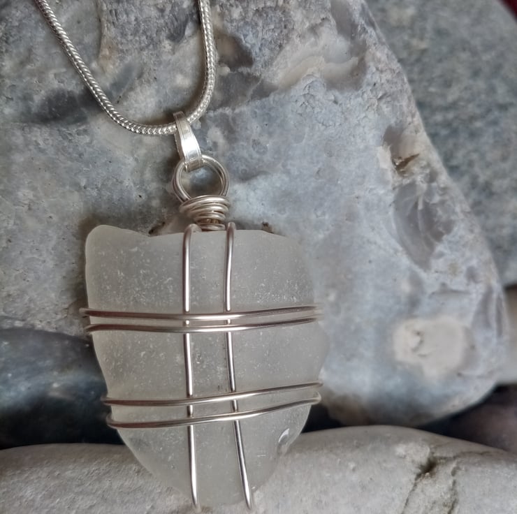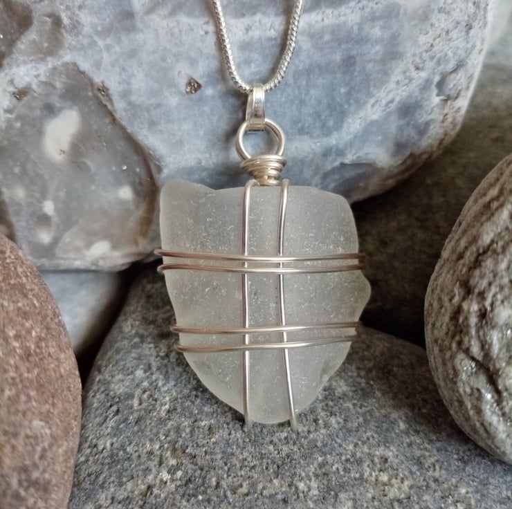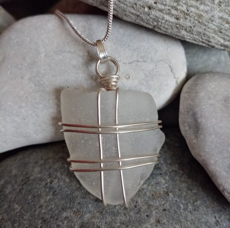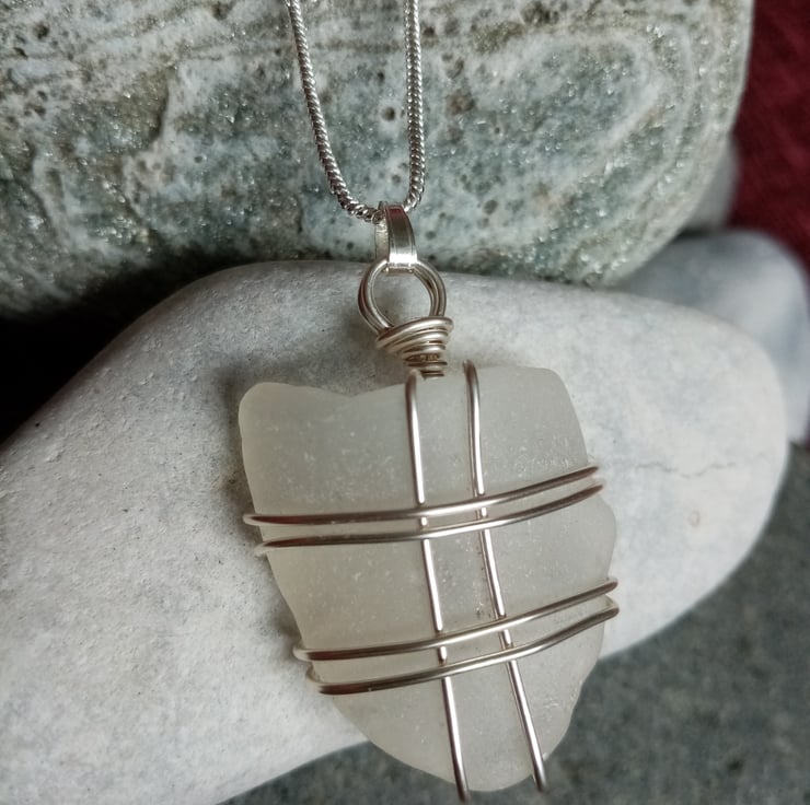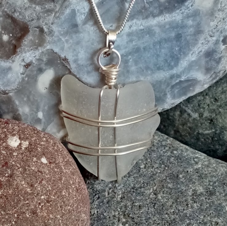 Let the seasonal sunshine bring with it the festive joys of ocean treasures shaped and frosted by endless rolling waves and allow the secrets of the mermaids to enthral and delight your days with this wire-wrapped sea glass pendant.