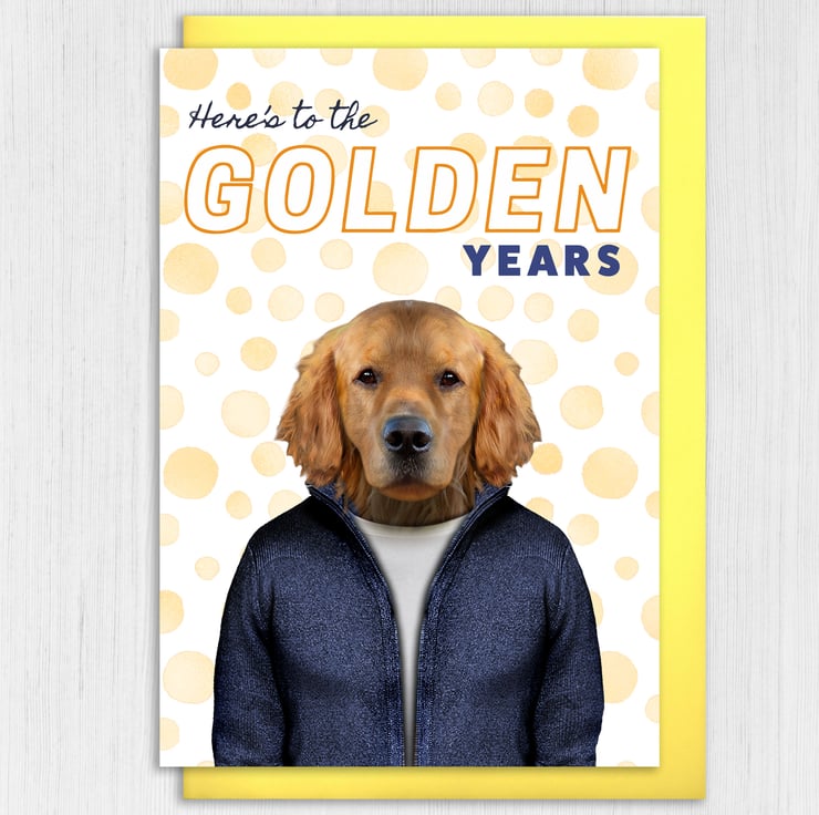 Here's to the golden years Retriever dog animal in clothes birthday card for old man, lady, friend, mate (Animalyser) Size A6/A5/A4/Square