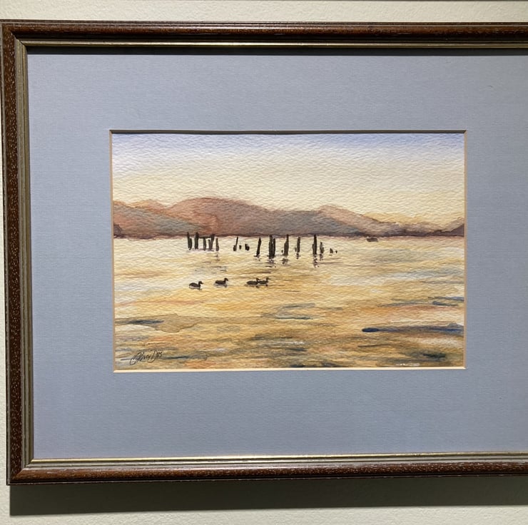 An original watercolour painting of Loch Lomond, gateway to the Scottish Highlands. Presented in an attractive wooden frame with a light-blue mount. Approx. dimensions: frame 3730xcm; image: 23x16cm.