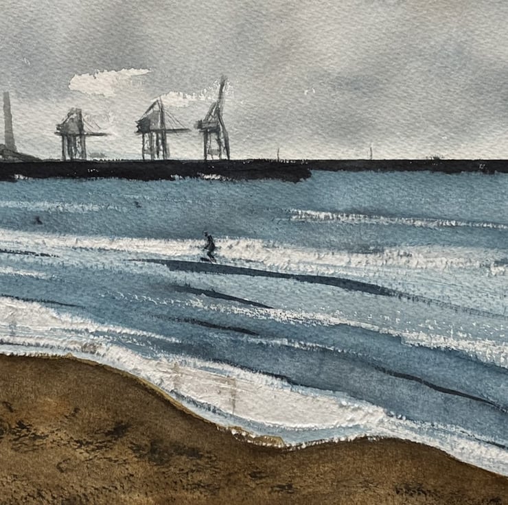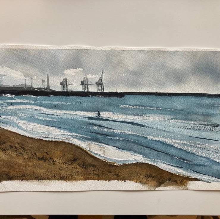 An original watercolour painting of surfers at Aberavon Beach, South Wales, signed by the artist. This painting is UNFRAMED (see photo). Approx. dimensions: 42x22cm.
