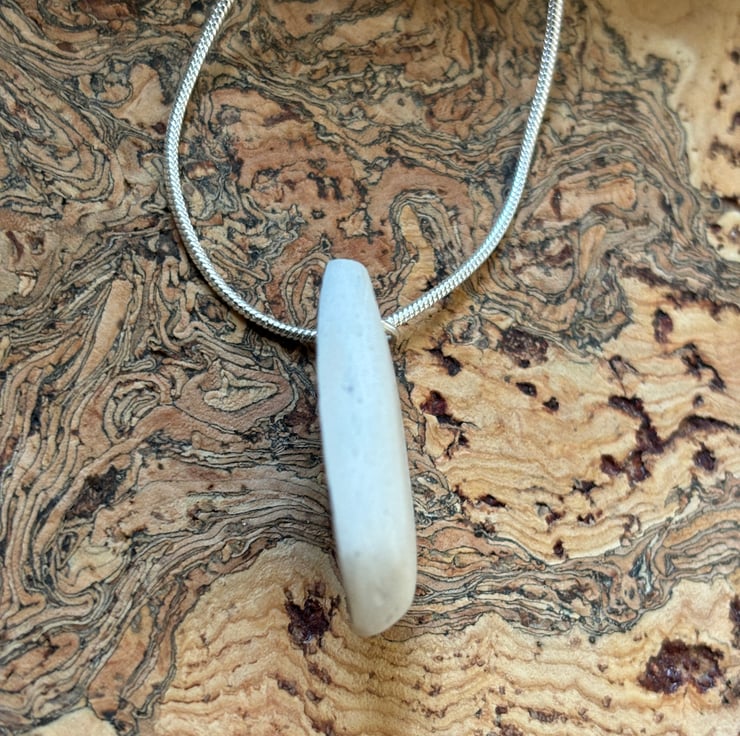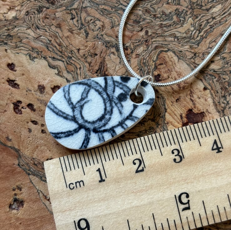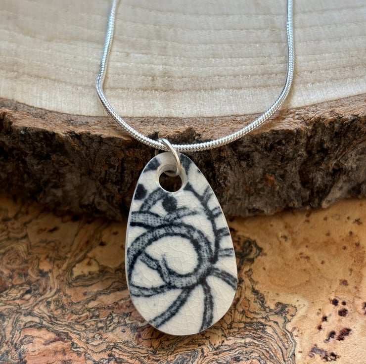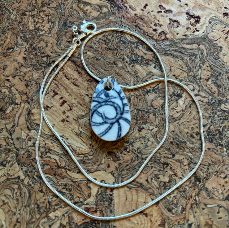 I found a lovely chunky shard of ceramic, sitting face up with swirling blue patten. After a thorough clean I gently drilled a hole and clipped the piece into shape. I wanted to be able to preserve the pattern but unfortunately the glaze started to break off so I sanded to the point where the glaze is completely stable. This has created a unique pendant, the shine still remains on the glaze and there are some scratches but I managed to at least keep part of the central swirl. Front glaze in tact, back and sides smoothed and sealed with eco friendly non toxic matt sealant.
