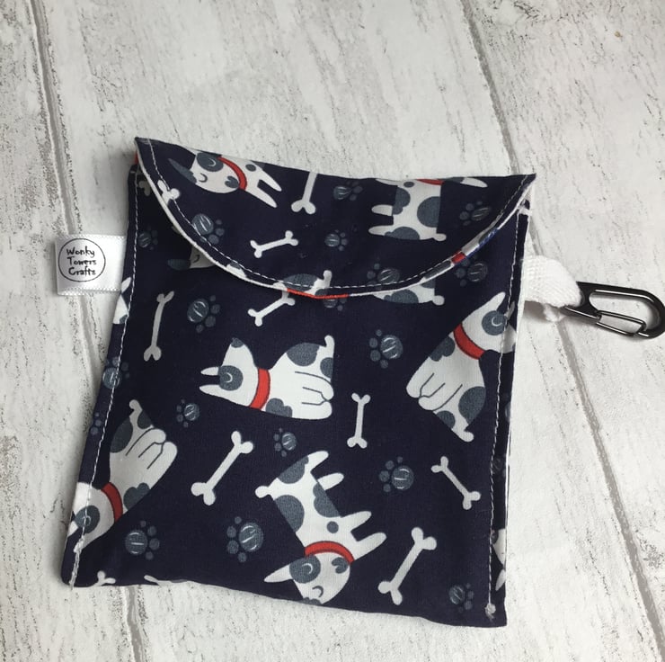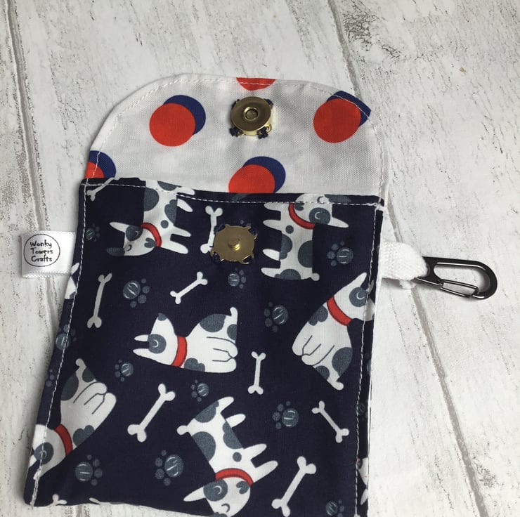 This treat bag is ideal for carrying some tasty incentives. Measuring approximately 11cm square, the pouch is made from doggy-decorated cotton fabric and is lined with PUL (a fabric that has a thin layer of plastic lamination which means it keeps food fresh and clean). It's big enough to hold not only a handful of treats but also a spare roll of pooh bags. The strong little clip will securely attach the pouch to your belt loop, back pack or dog lead and the magnetic fastening means that it's easy to open and close, even when your hands are cold.