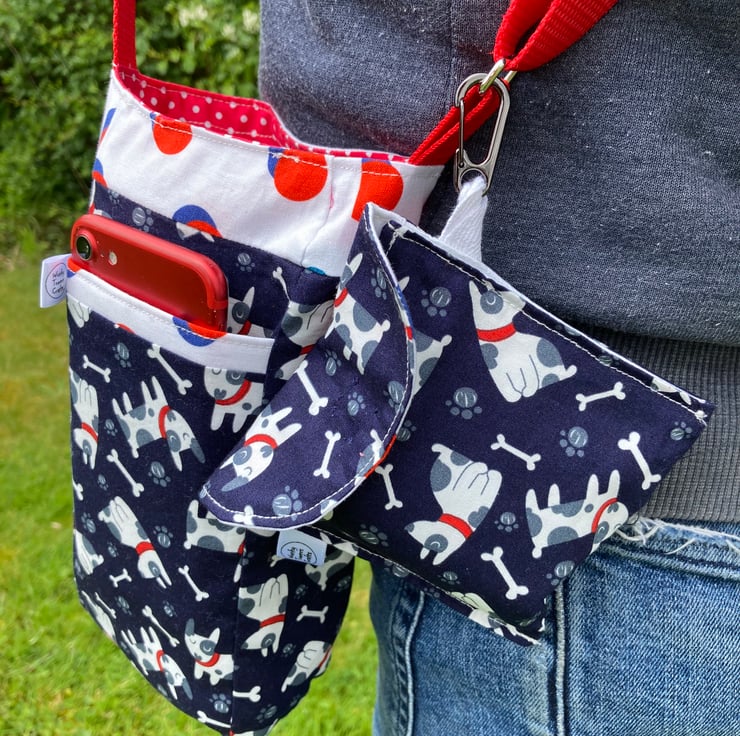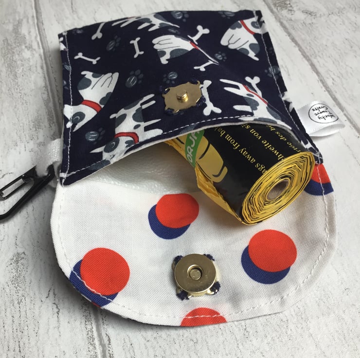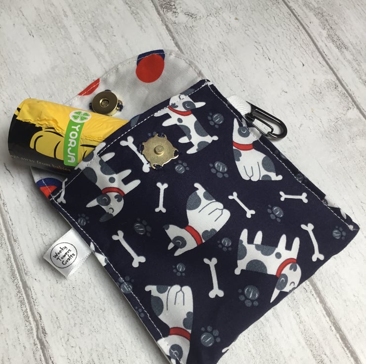 This treat pouch is made from navy doggy fabric with a contrast fabric inside the flap. The lining is white. The whole thing is washable in the machine or you can just wipe the lining clean. It coordinates beautifully with some of our other products and is shown here clipped to one of our water bottle bags.