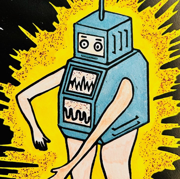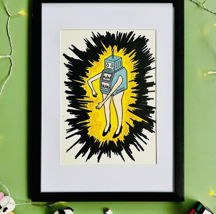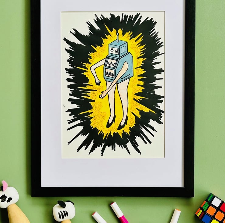 Robot print. Drawing inspiration from toys and comic books, the title of this print is ' Live Your Dream'. Its about a Robot that actualises its thoughts. Each one is lovingly hand made, as such there will be individual variations and signs this art is produced through a handmade process.