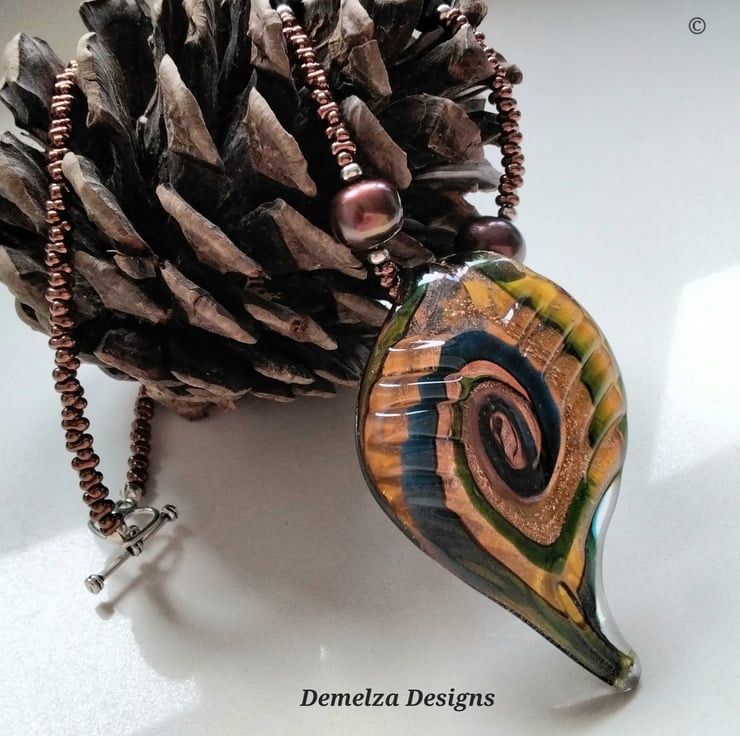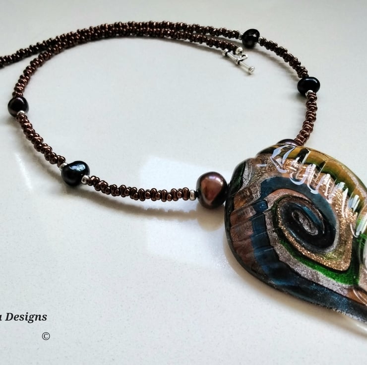 This gorgeous eye catching necklace has been designed and hand crafted in Cornwall using a genuine Murano Glass pendant complimented with two large chocolate brown baroque pearls and smaller teal and chocolate brown baroque pearls. The peanut shaped seed beads form a rope effect.