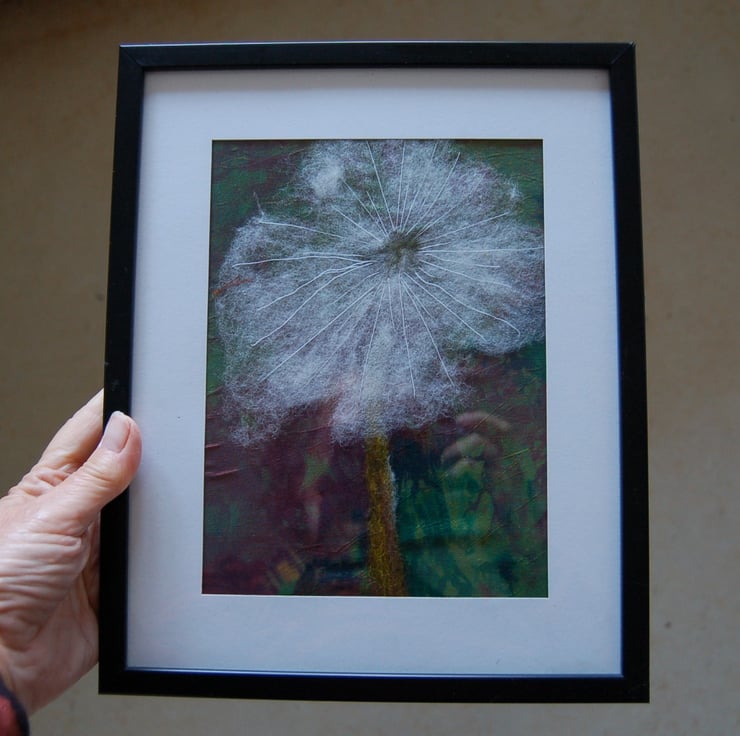 A pretty framed picture of a dandelion seed head. A delightful light and airy dandelion clock made using white wool fibres and hand embroidery stitches worked onto a piece of hand dyed silky fabric in shades of green.