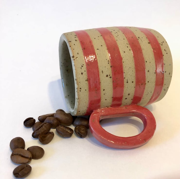 This dinky little espresso cup measures 6.5 cm tall by 5cm across and is perfect to hold a shot of coffee. Thrown in Sibelco spotted clay I’ve added red glaze stripes on the outside and a clear food safe glaze on the inside. With its stylish D shaped handle it’s perfect for the fussy coffee lover in your life!