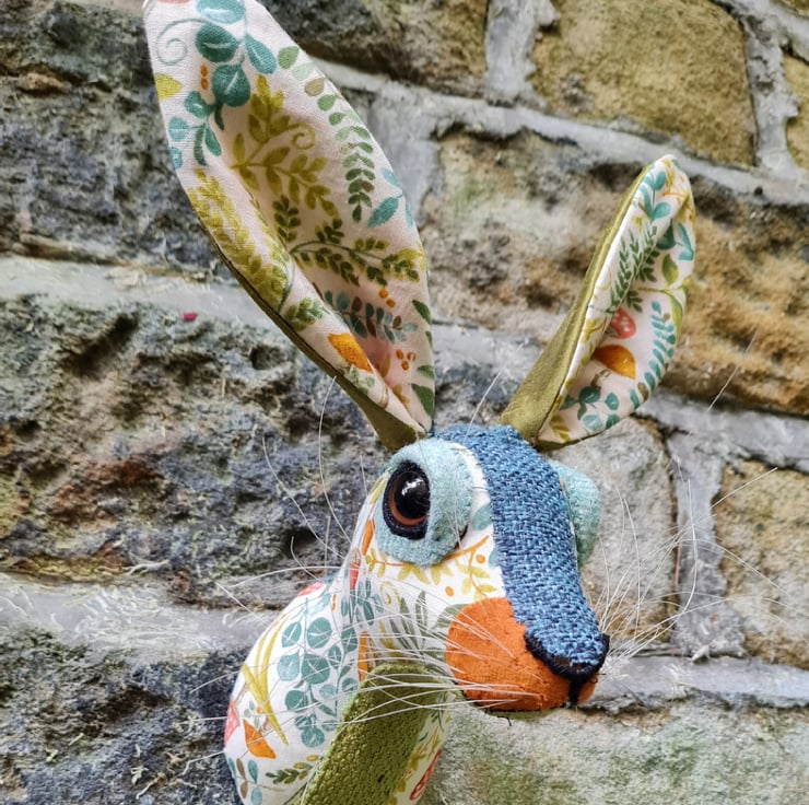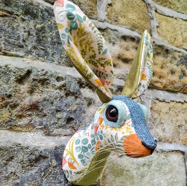 A lifesize textile hare head which I have hand stitched with a magical woodland patterned fabric, embellished with turquoise tweed and green taffeta lined ears.