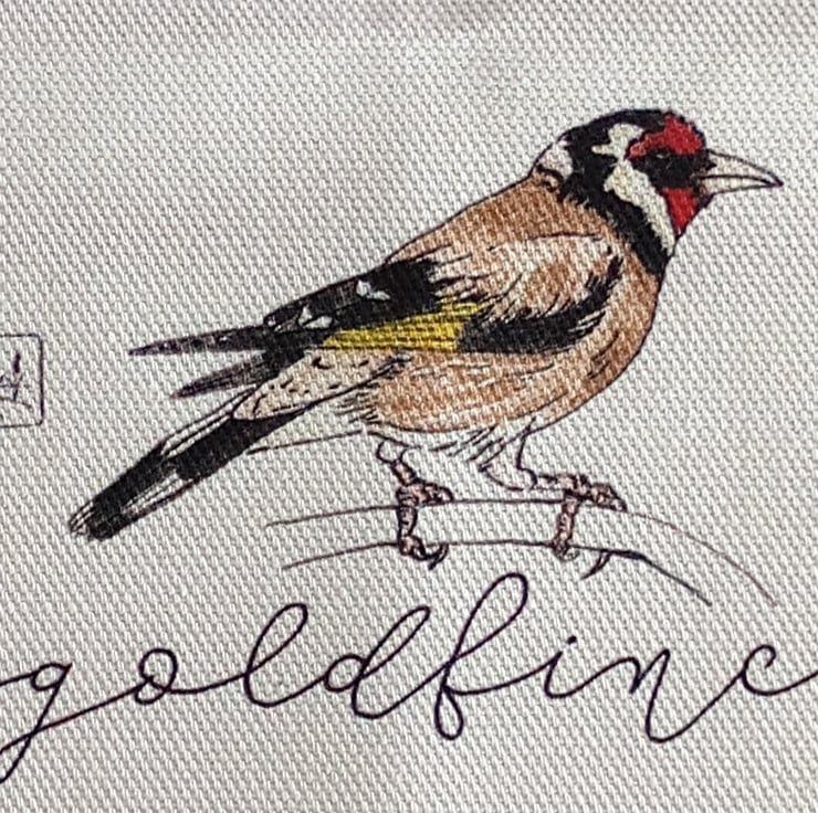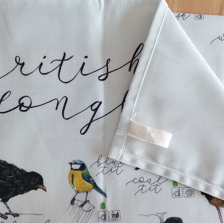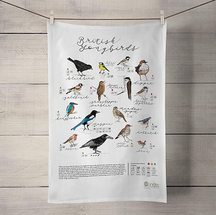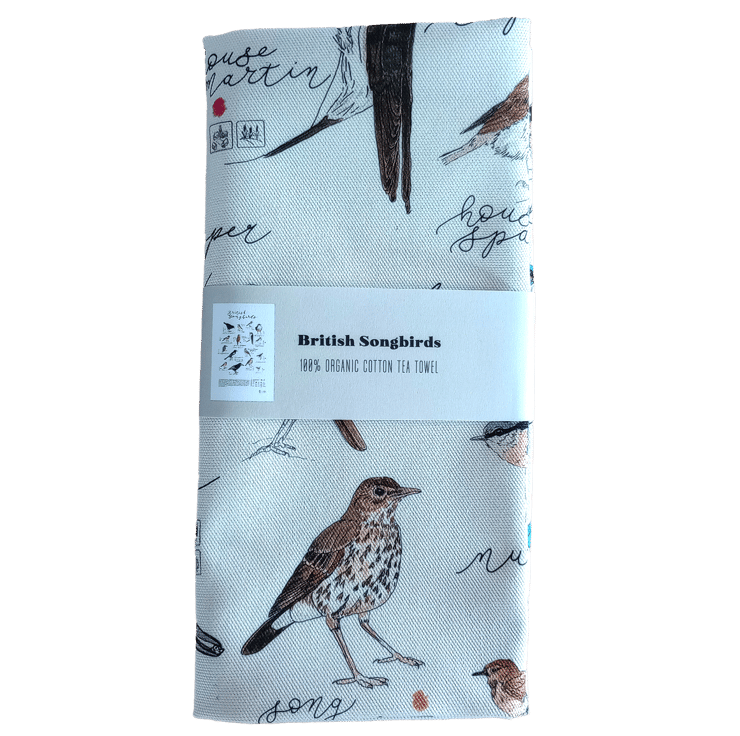 This 100% unbleached organic cotton tea towel features sixteen illustrations of British songbirds, hand-drawn in ink and watercolour and with a hand-lettered name label. The featured birds are: blackbird, blue tit, coal tit, dipper, goldfinch, grasshopper warbler, house martin, house sparrow, kingfisher, magpie, meadow pipit, nuthatch, robin, rook, song thrush and wren. The tea towel also includes information about the birds' habitat and their Conservation Status.
