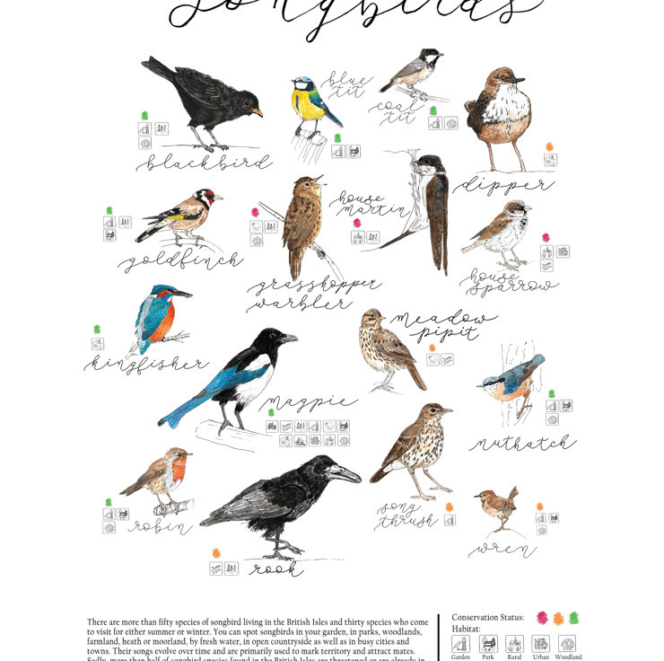 In 2024 I took part in an illustration challenge to draw a British Songbird every day throughout the month of February, in support of the charity Songbird Survival. I had such an amazing time illustrating birds and finding out more about them and their Conservation Status (how endangered a species is), that I wanted to take some of the illustrations and create a collection that included some of the educational information. My British Songbirds collection includes an A4 art print, a tea towel, a selection of square note cards and some wooden coasters. All of the products are eco-friendly and made in the UK and I deliver everything plastic-free.
