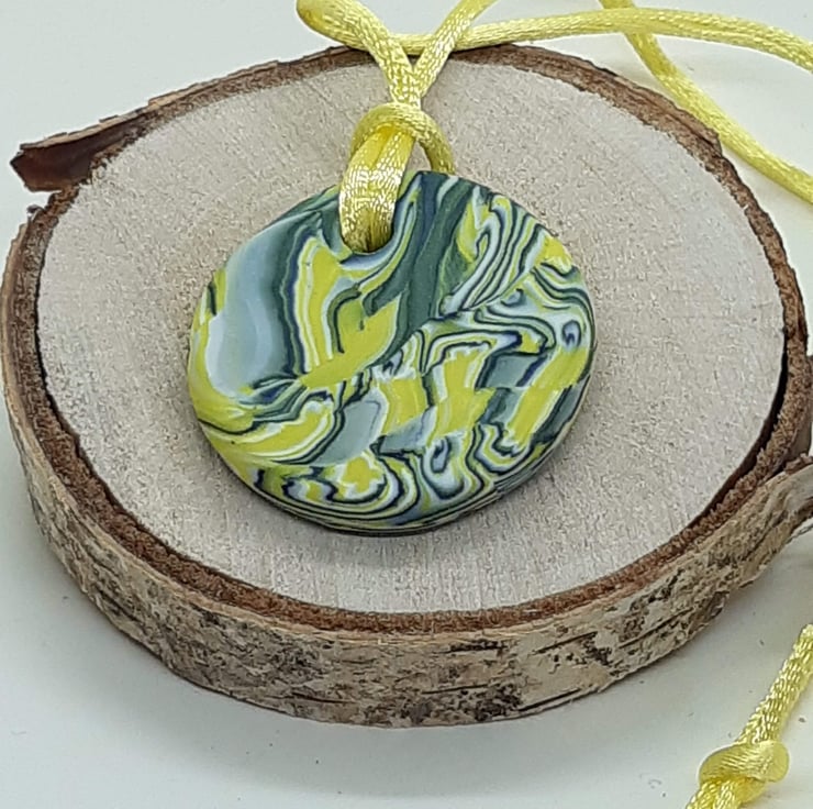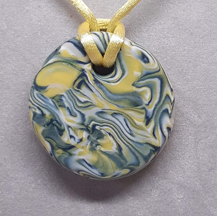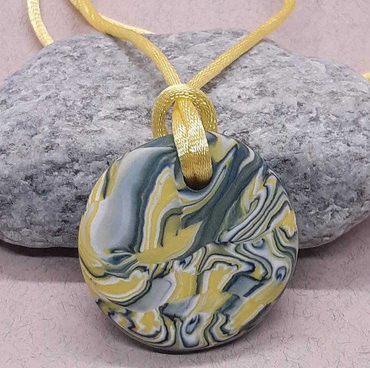 A round polymer clay pendant handblended in a yellow, white, dove grey and dark navy unique swirl design