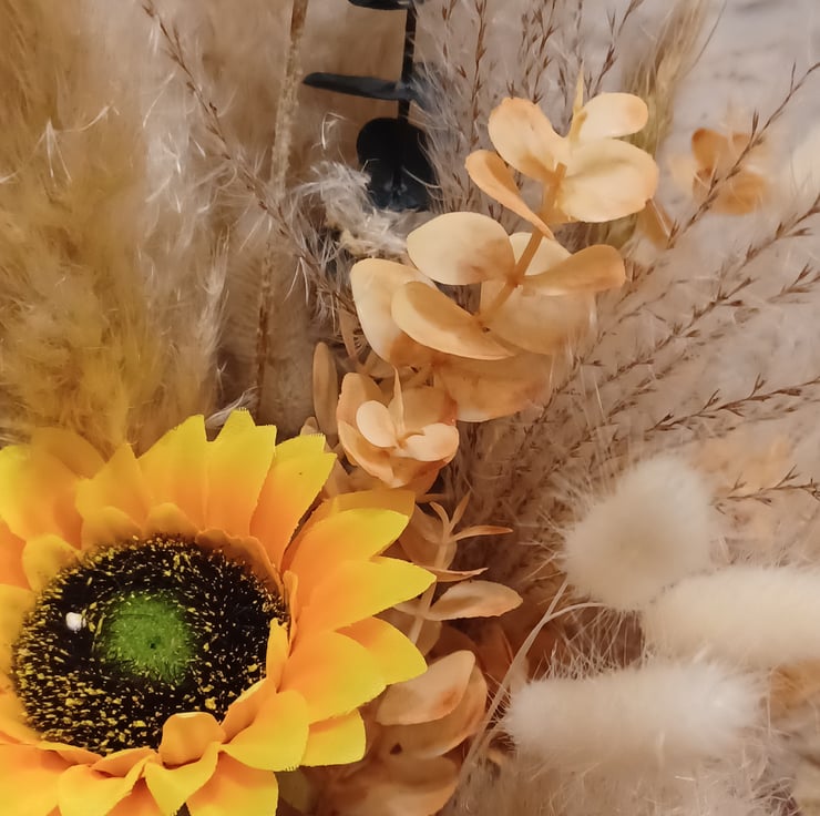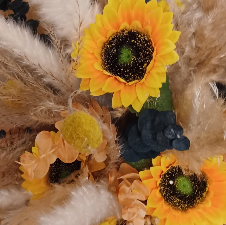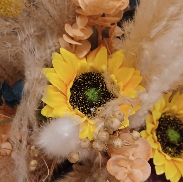 This arrangement has a mix of dried grasses and flower heads, along with eucalyptus stems in orange and dark green to compliment the Sunny Sunflower stems beautifully.