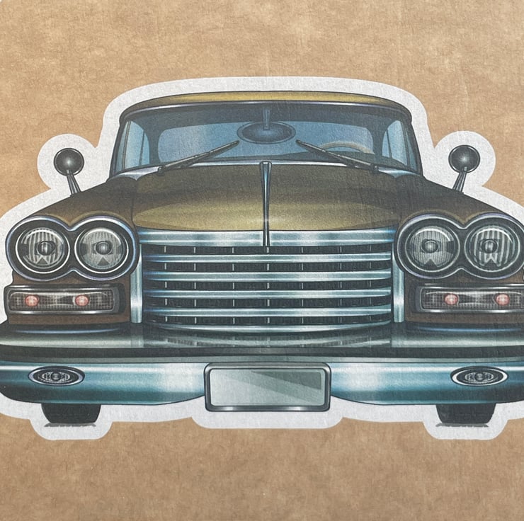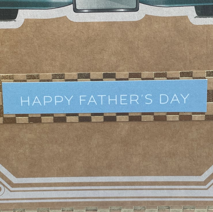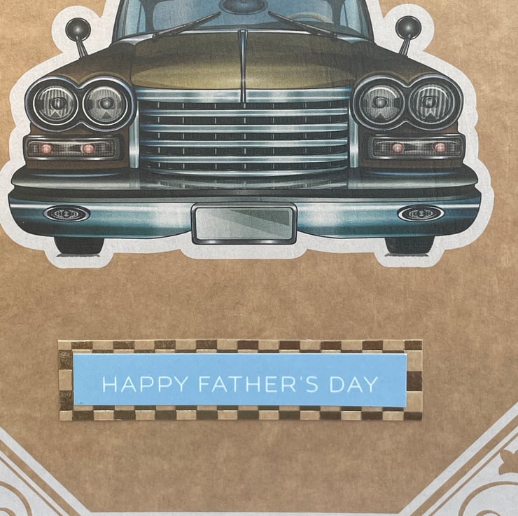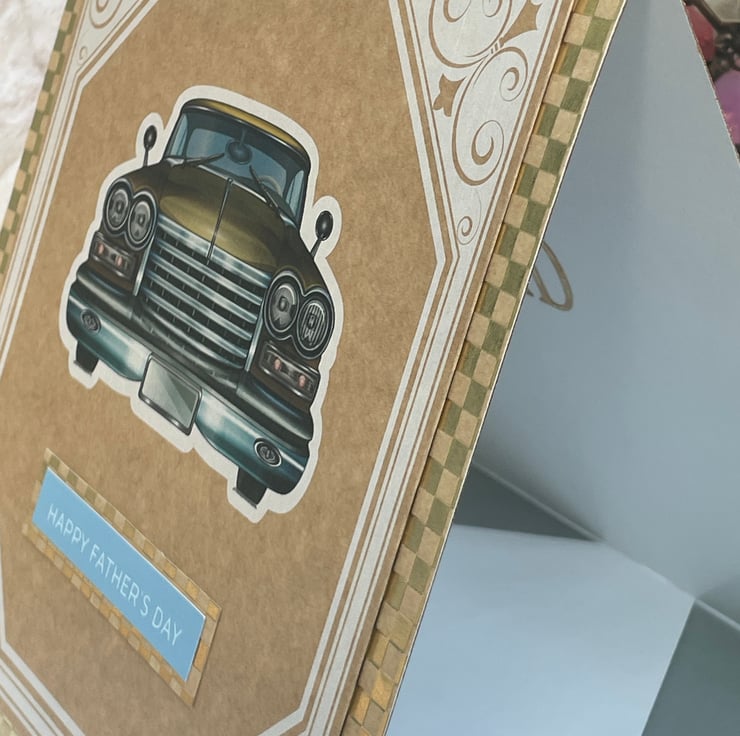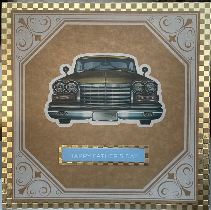 A fantastic card for the petrol head in your family. This 20x20cm card has a gold and kraftcard chequerboard background. This is topped with a large image of an American classic car.This has a white scroll border. The greeting says Happy Father's Day. Inside the card has Dad cut out of matching checkered card. A super way to celebrate a car loving Dad.