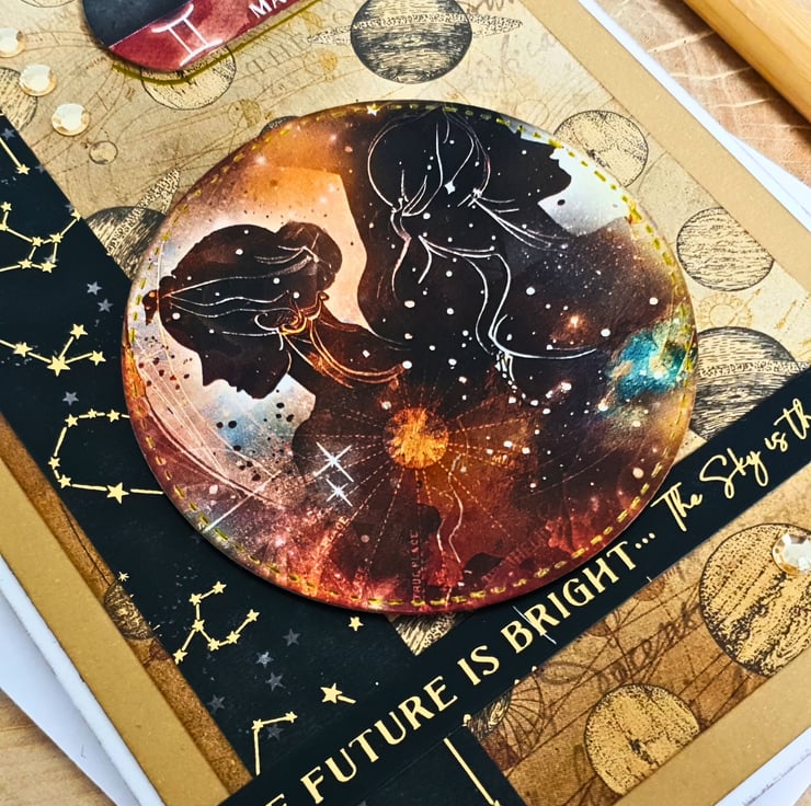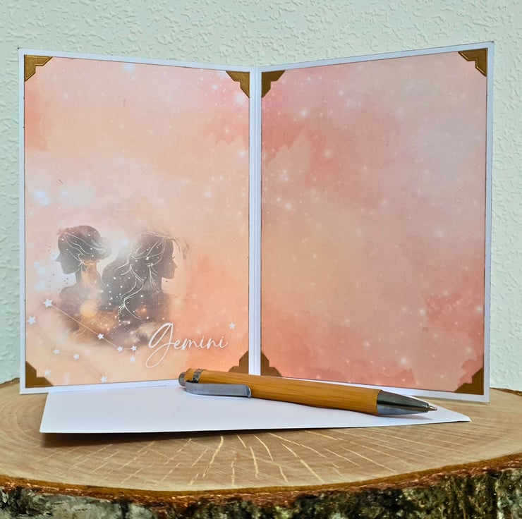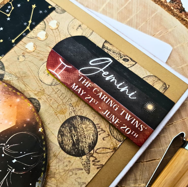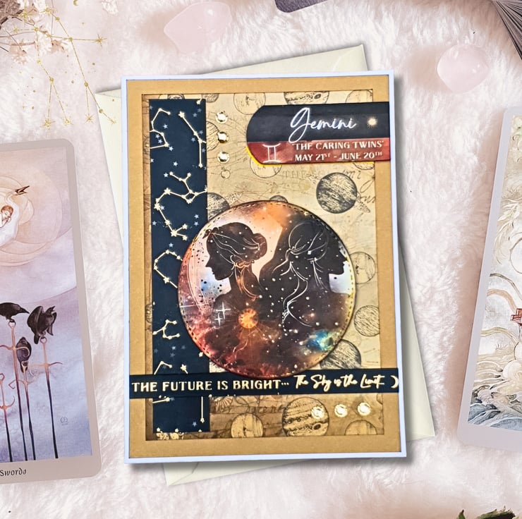 The card consists of mats & layers of gold pearlescent card, luxury paper with a pattern of planets & toppers, all in zodiac theme. The decorative strip at the bottom reads: "The future is bright... The sky is the limit", while the tag on the top right mentions the Gemini Dates. It is decorated with diamante gemstone embellishments in gold. Finished with a double coordinating insert that has been left blank, for you to add your own messages and wishes. It measures approx.5" x 7" (12.7x17.8cm). It comes with a white envelope to match the size of the card & is kept in a clear cellophane bag for protection. A small sticker with my shop details has been added at the back of the card.