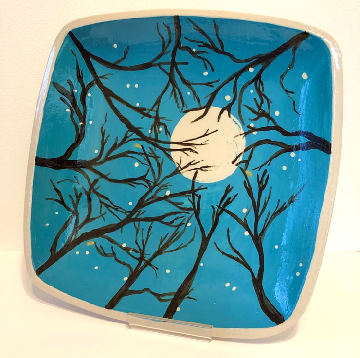 I created this dish from scratch in my home pottery studio at the bottom of the garden! One of my favourite things to do in winter is watch the moon rising. Here I've used underglazes to paint window twigs cradling the full moon.