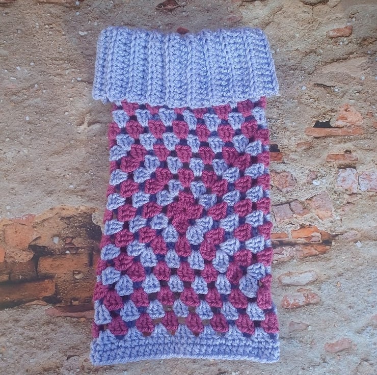 I crochet it from acrylic yarn lavender blue and purple colours