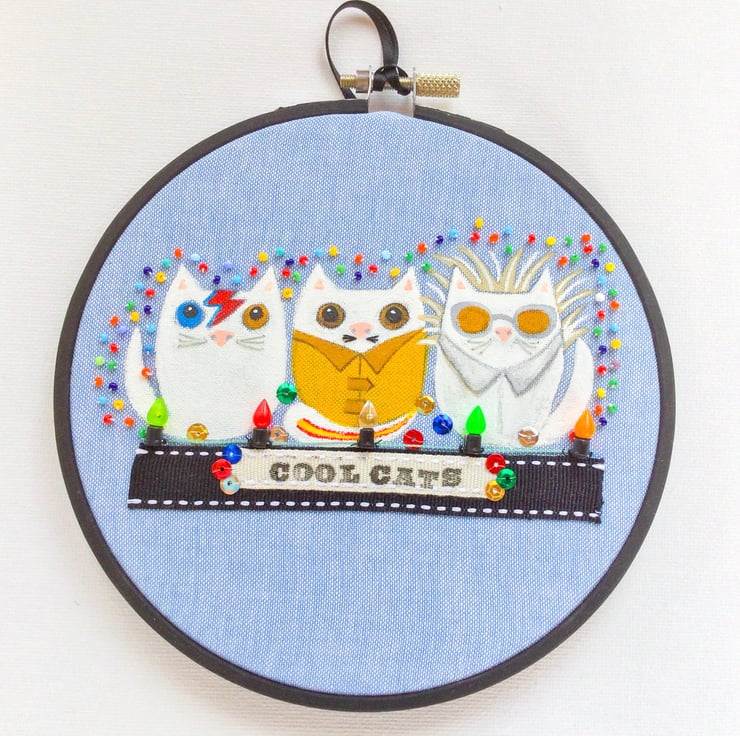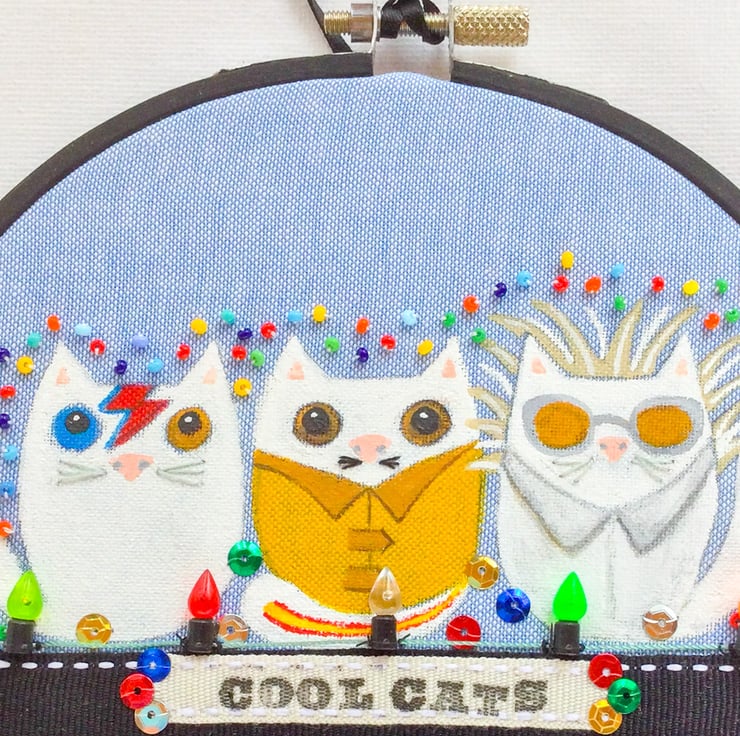 This design has been achieved by hand painting 3 white rock and roll cats. With their own ribbon stage and a sprinkling of beds and sequins, I’m sure these rock and roll cats would love to hang on your wall.