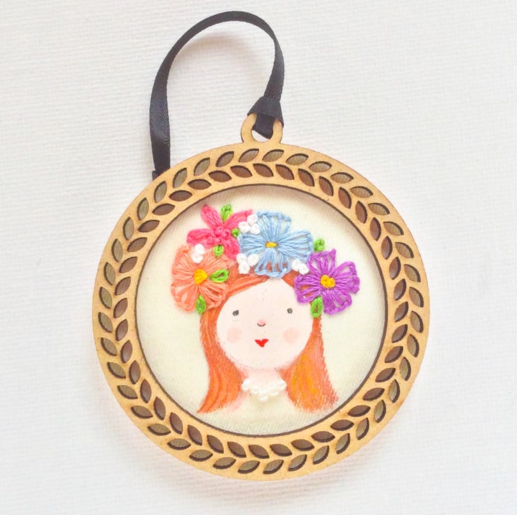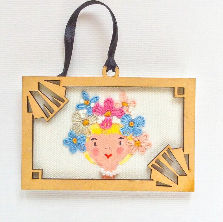 A unique hand painted, hand embroidered group of “Ladies that lunch”. Each in their own wood frames these ladies are a pretty trio of treasures with their floral head dresses and seed bead necklaces. An ideal keepsake for a special group of friends.