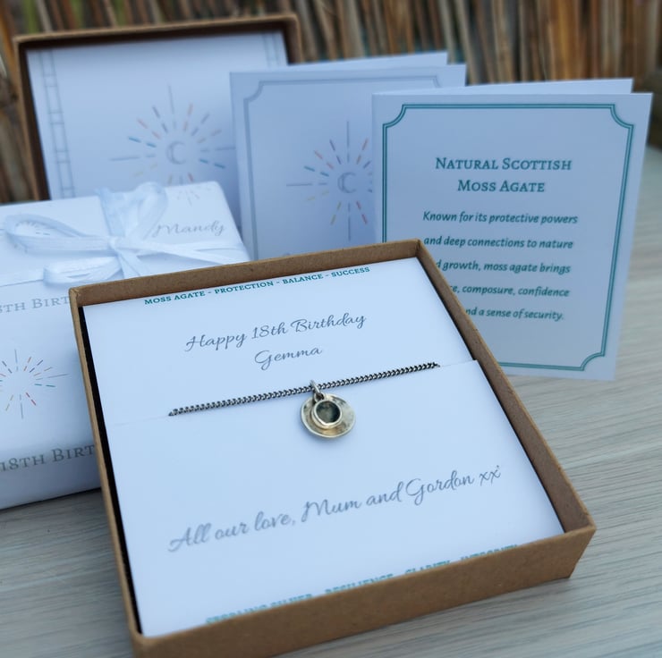 You can read the booklet that comes with my Tayside moss agate designs in the images, or you can find this design with other Scottish stones in the Caledonian Keepsakes shop.