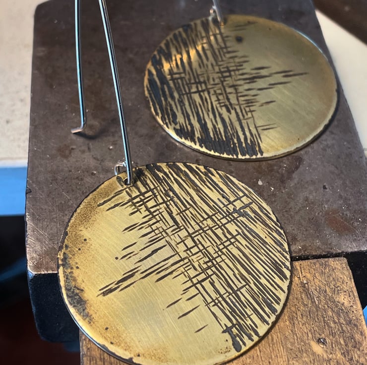 Large Brass disks, that have been hammered, shaped and oxidised to create a one of a kind statement earring. Unique hand shaped sterling silver ear wires finish the look.