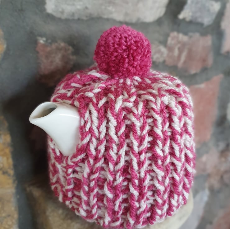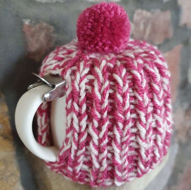 Hand knitted using double strands (two balls at the same time) of Aran weight yarn in a 1 x1 ribbed pattern, makes this cosy extra thick. It's not called a cosy for nothing!