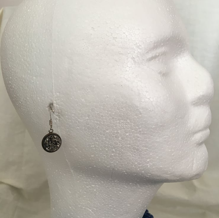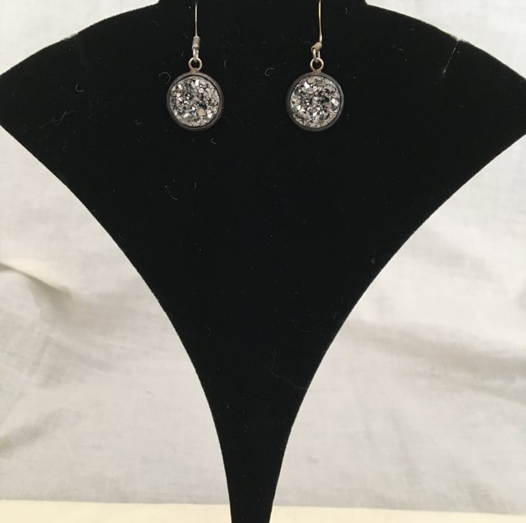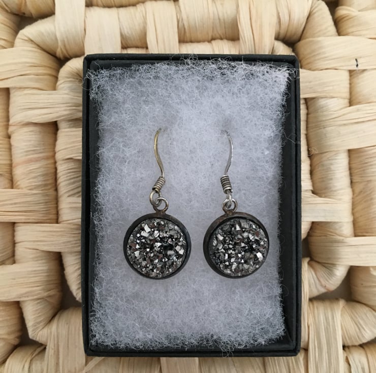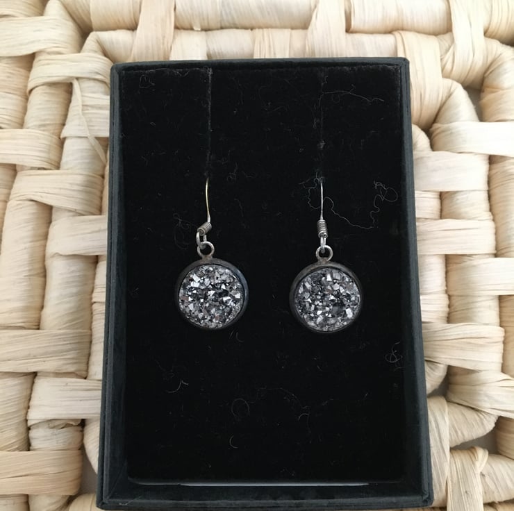 Glittering earrings with a resin druzy cabochon centre. The particles mixed in the resin reflect the light bringing the black/grey colouring of the earrings to life.