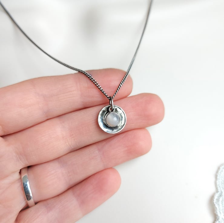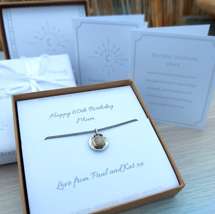 Handmade from scratch, you can personalise the reverse of the stone as well as the disc. If you choose to add a tag to your chain, this can also be personalised with a stamp. You can even add a personal message to the inside of your box.